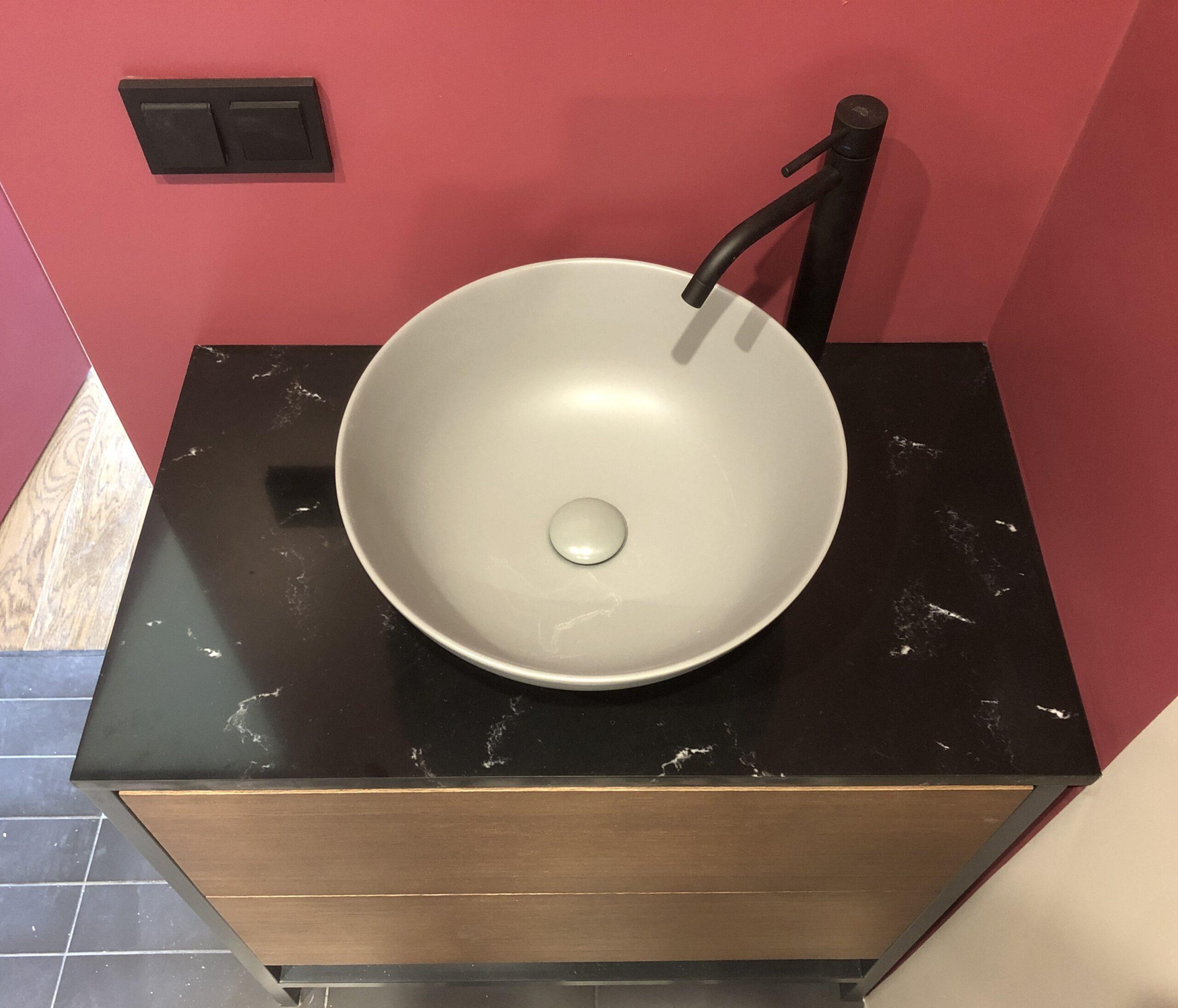 В настоящее время все больше людей обращают внимание на детали при оформлении своего дома, особенно когда речь идет о ванной комнате. Одной из ключевых составляющих современного дизайна является столешница. И, если вы хотите создать стильный интерьер, то столешница из акрилового камня - отличное решение. Длина столешницы - 838 мм, ширина - 450 мм. Цвет камня - черный с трендовым мраморным рисунком Hi-Macs M703 Midnight. Такая композиция отлично подчеркнет современность вашего пространства, создаст ощущение роскоши и элегантности. Наша компания изготавливает изделия из искусственного камня любой сложности. Если у вас есть свой дизайн-проект, не стесняйтесь отправлять его нам. Наши специалисты проконсультируют вас по всем возникающим вопросам и помогут создать идеальное решение для вашей ванной комнаты.