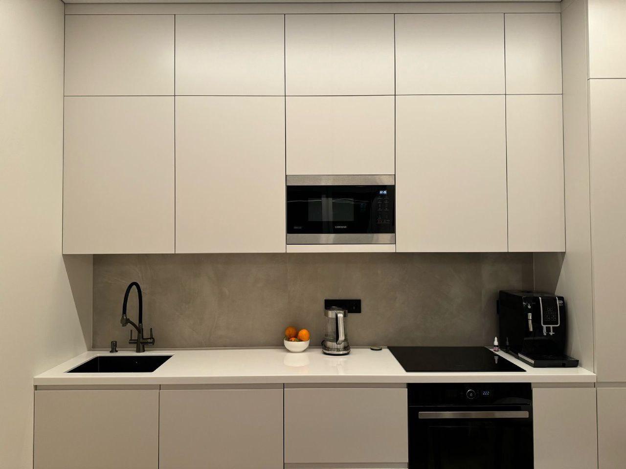 В данном проекте для изделия клиенты выбрали акриловый камень Staron Metallic Yukon EY510. К столешнице подобрали черную мойку с подклейкой снизу. Она контрастно выделяется на фоне светлой столешницы.
