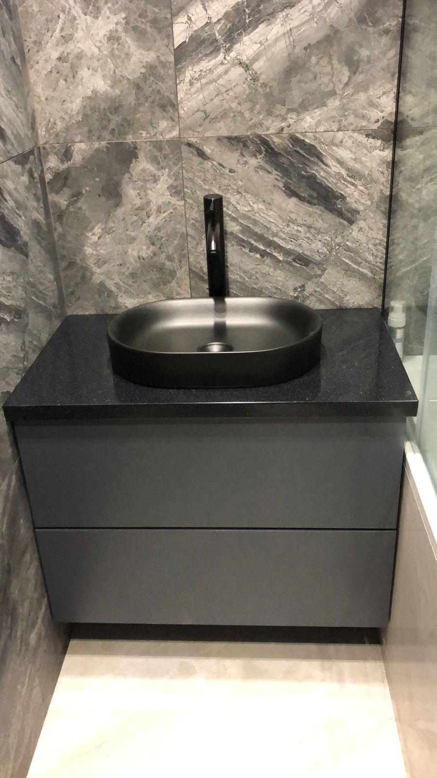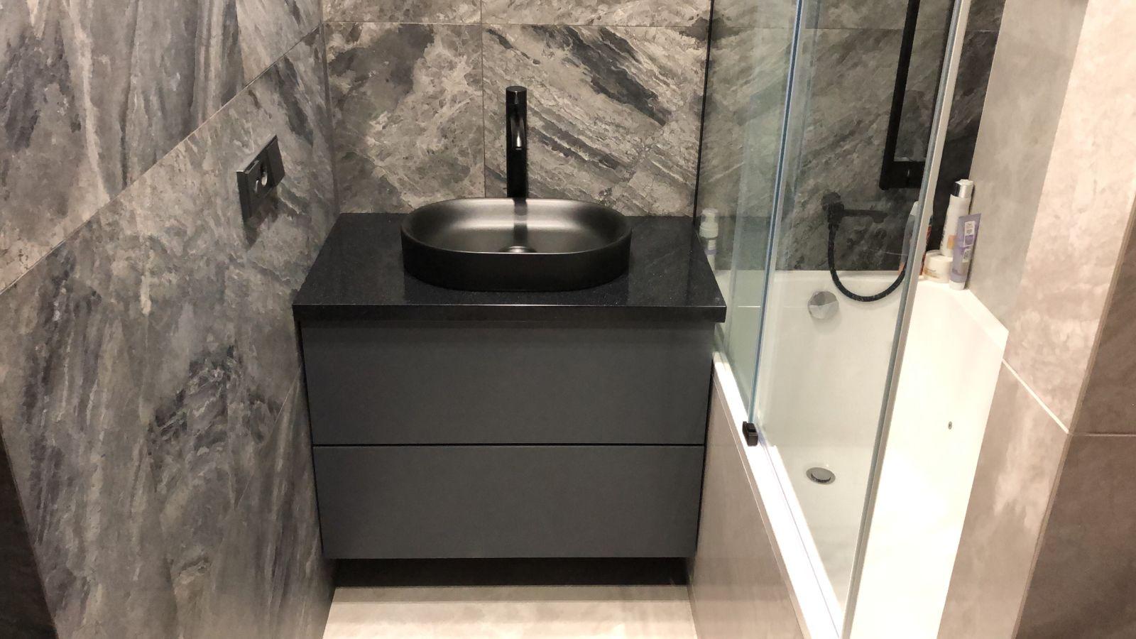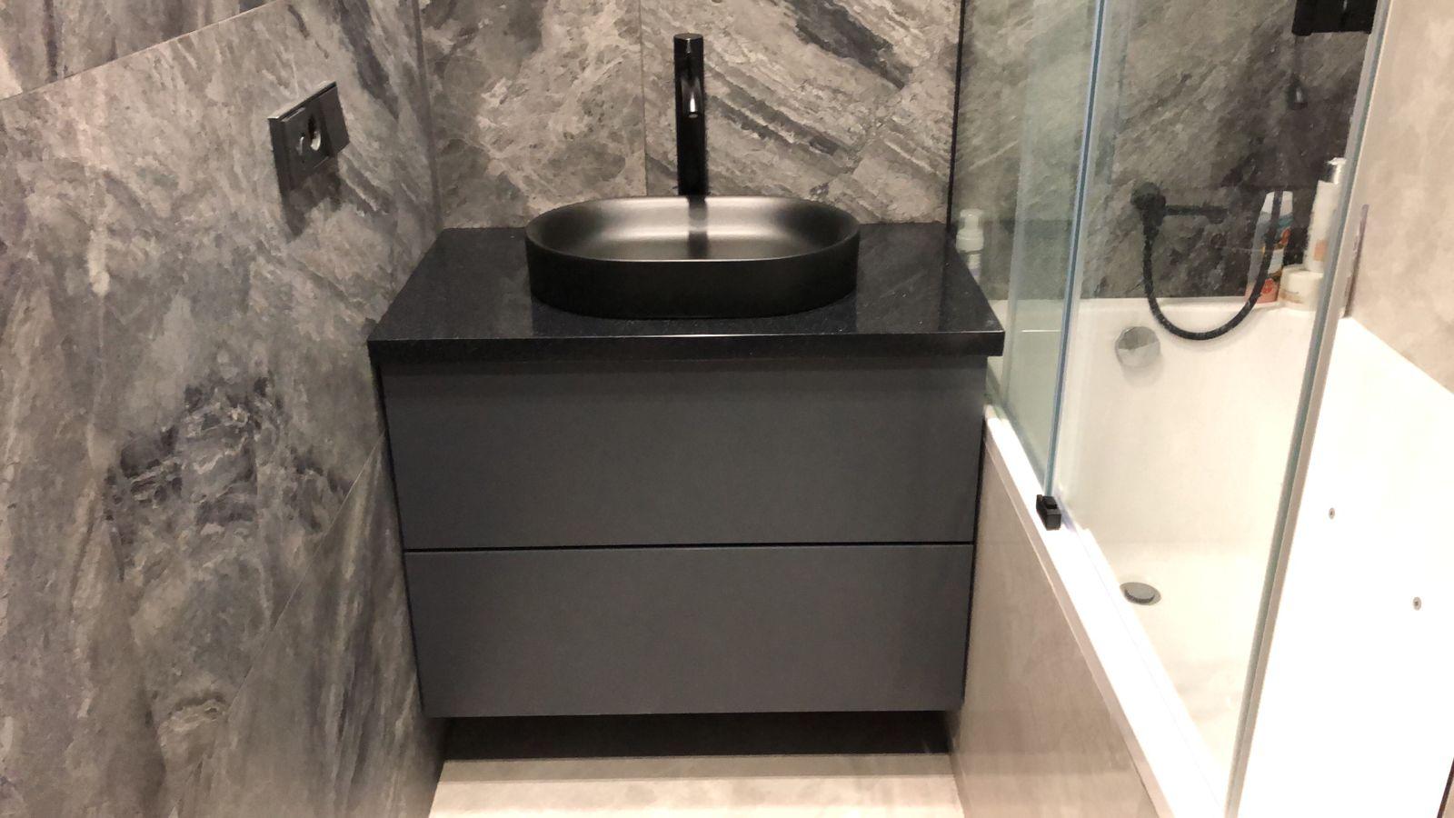 Столешница для тумбы в ванной изготовлена из черного искусственного камня с мелкими вкраплениями. Сверху установлена накладная раковина-чаша клиента. Простое и лаконичное решение для небольшого санузла!
