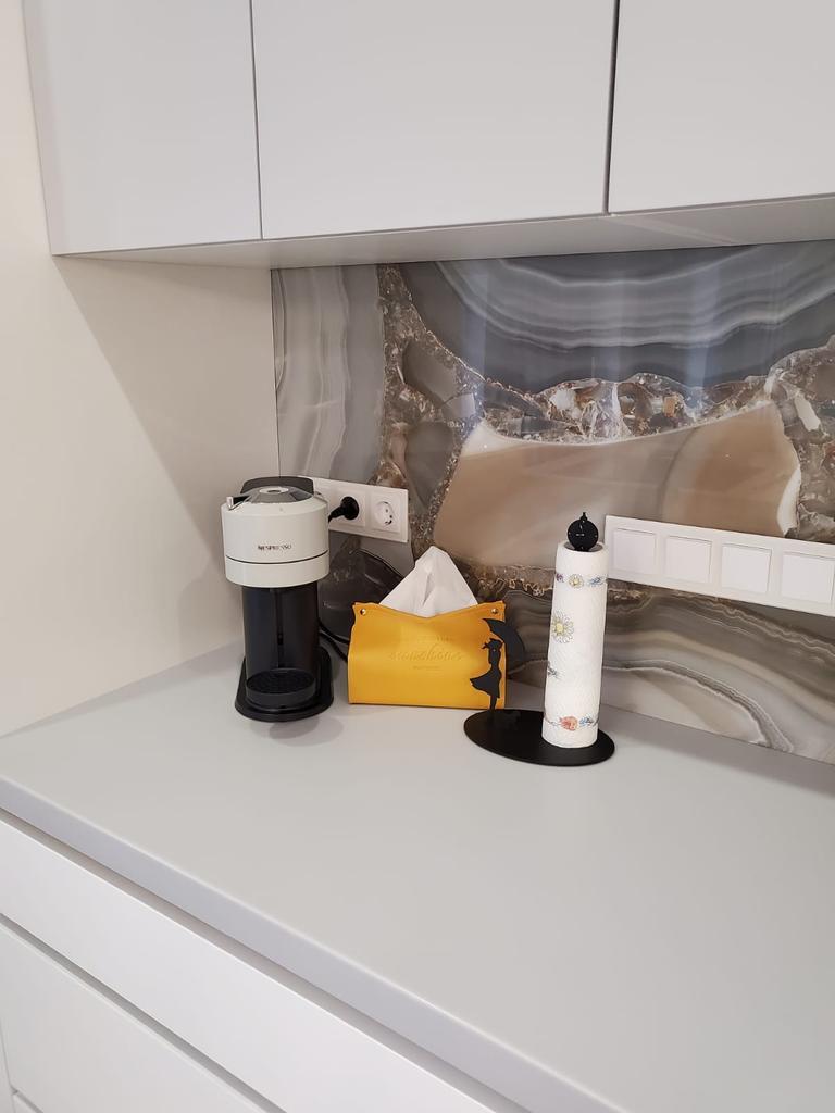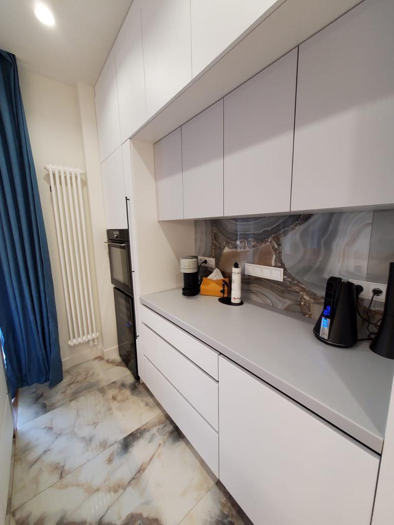 Две прямые столешницы на кухню изготовлены из акрилового камня - Staron SF020 Fog. Этот серый однотонный цвет камня добавляет элегантности и сдержанности кухне. Поверхность столешницы - матовая - приятная на ощупь.