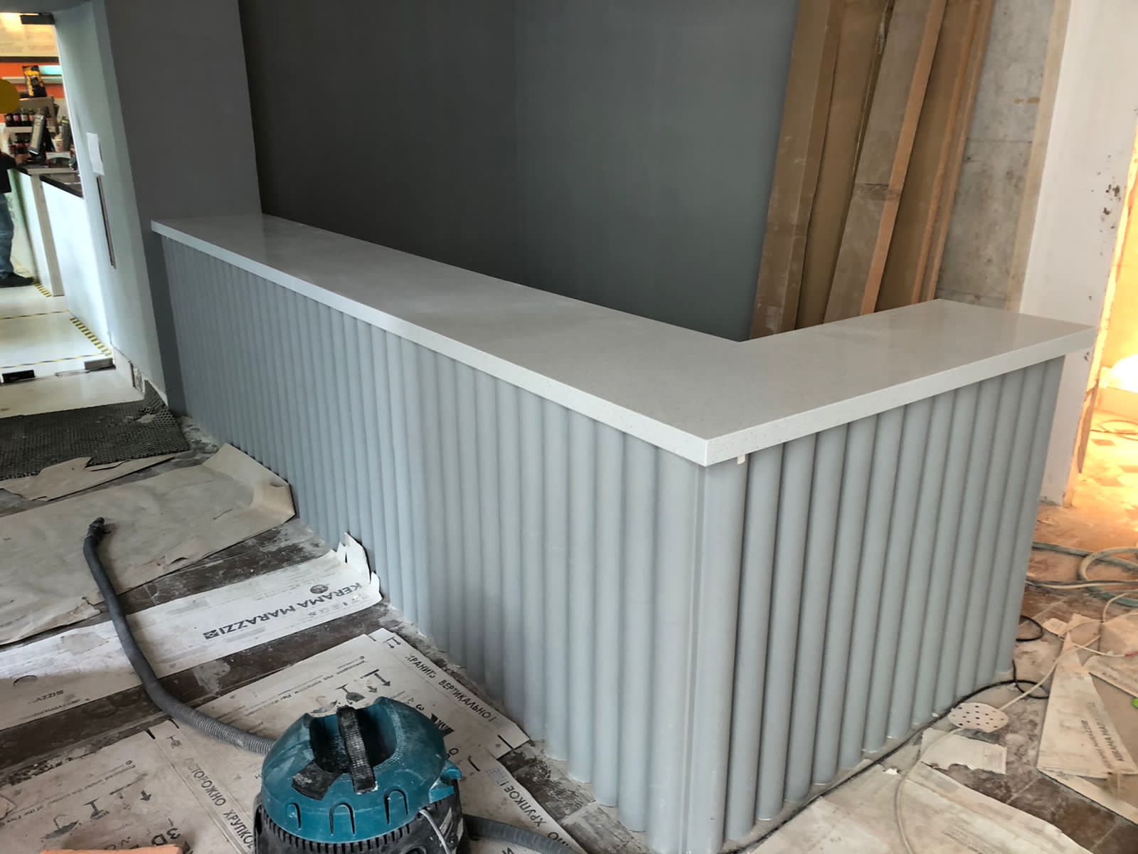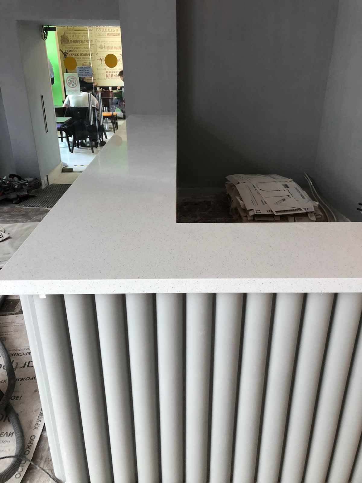 Бесшовная угловая столешница из безопасного и стильного искусственного камня Grandex A-423 Industrial Draft представляет собой прекрасное дополнение к интерьеру салона красоты. Белый цвет камня с мелкими темными вкраплениями гармонично сочетается с дизайном, а поверхность из глянцевого материала придает интерьеру роскошный вид. Наши мастера могут придать изделию матовую поверхность по вашему желанию. Толщину также можно сделать любую по вашему усмотрению: начиная от 12 мм до 30, 40, 60 мм и более.