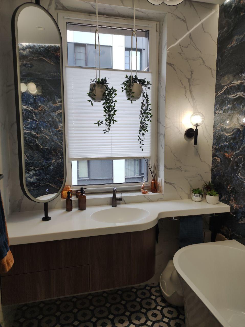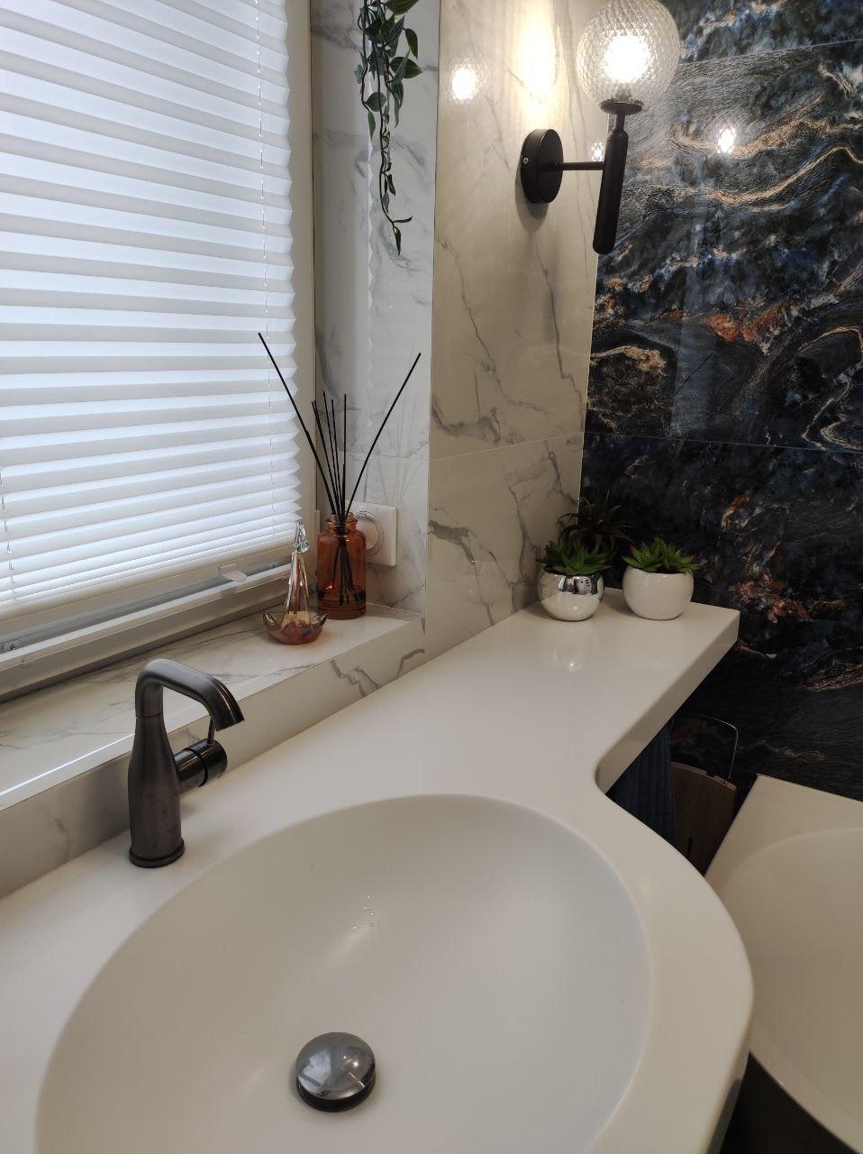 Особенностью этой столешницы является заужение со стороны ванны, благодаря которому у клиентки появилась полочка. Наш мастер установил на нее держатель для полотенец, что сделало использование ванной комнаты еще более удобным.