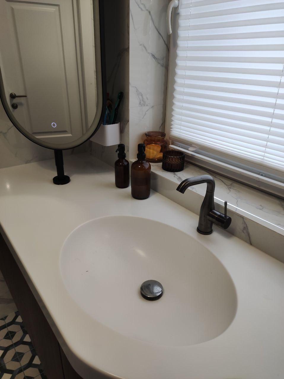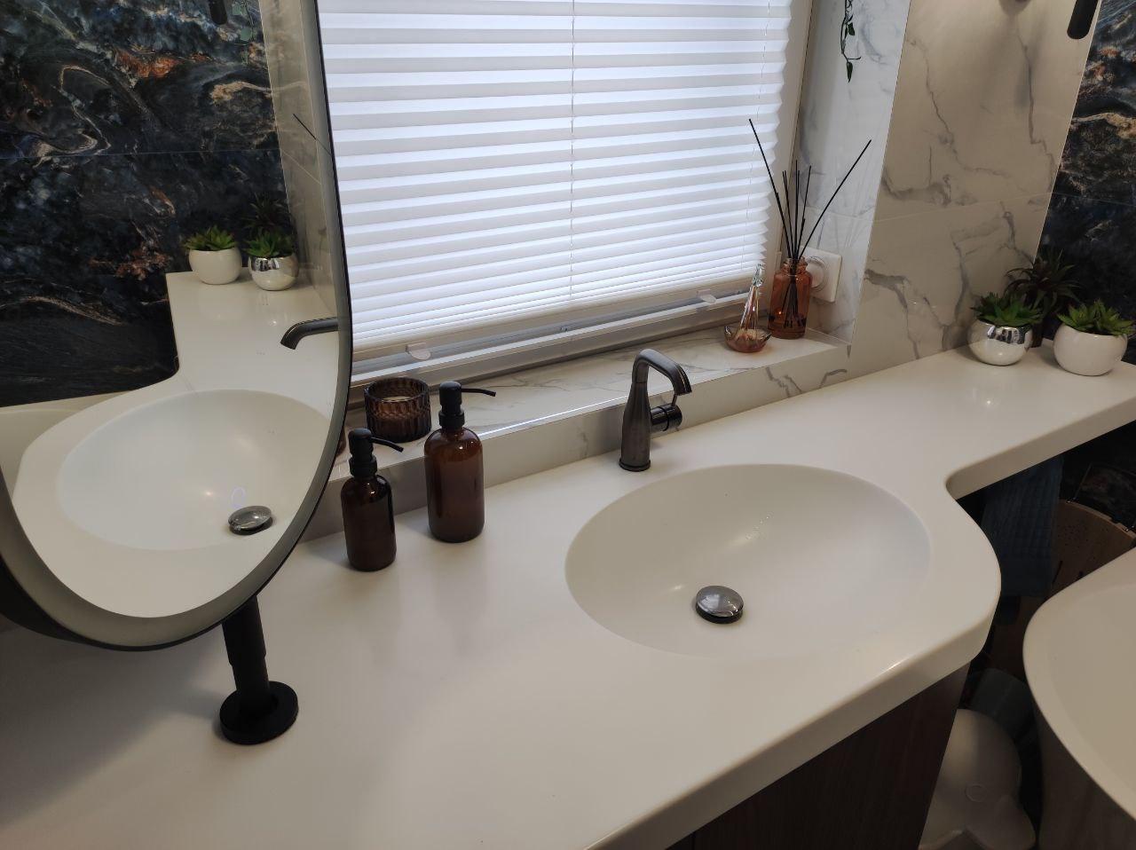 Столешница из искусственного камня с радиусным изгибом и раковина для ванной комнаты