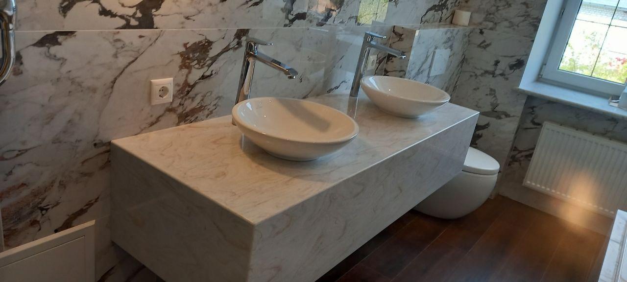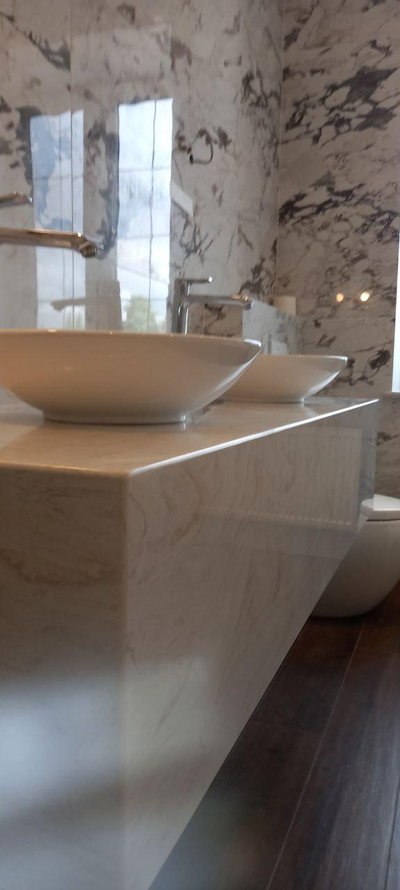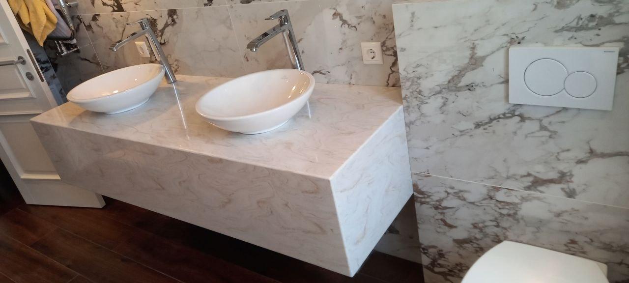 Столешница из искусственного камня с высокими бортами для ванной комнаты