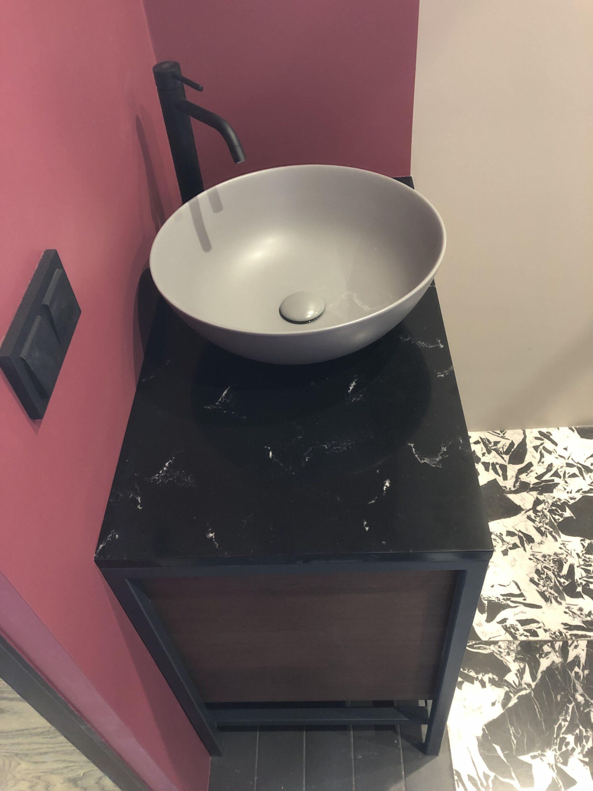 В настоящее время все больше людей обращают внимание на детали при оформлении своего дома, особенно когда речь идет о ванной комнате. Одной из ключевых составляющих современного дизайна является столешница. И, если вы хотите создать стильный интерьер, то столешница из акрилового камня - отличное решение. Длина столешницы - 838 мм, ширина - 450 мм. Цвет камня - черный с трендовым мраморным рисунком Hi-Macs M703 Midnight. Такая композиция отлично подчеркнет современность вашего пространства, создаст ощущение роскоши и элегантности. Наша компания изготавливает изделия из искусственного камня любой сложности. Если у вас есть свой дизайн-проект, не стесняйтесь отправлять его нам. Наши специалисты проконсультируют вас по всем возникающим вопросам и помогут создать идеальное решение для вашей ванной комнаты.