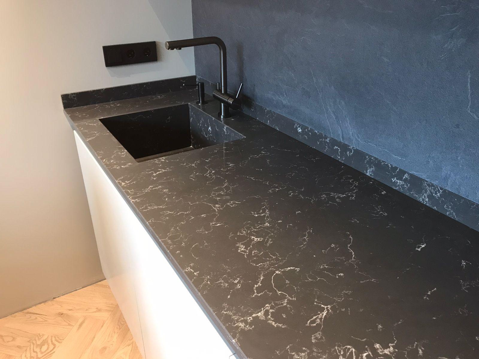 Столешница из кварцевого агломерата, мойка и пристенные плинтусы для кухни