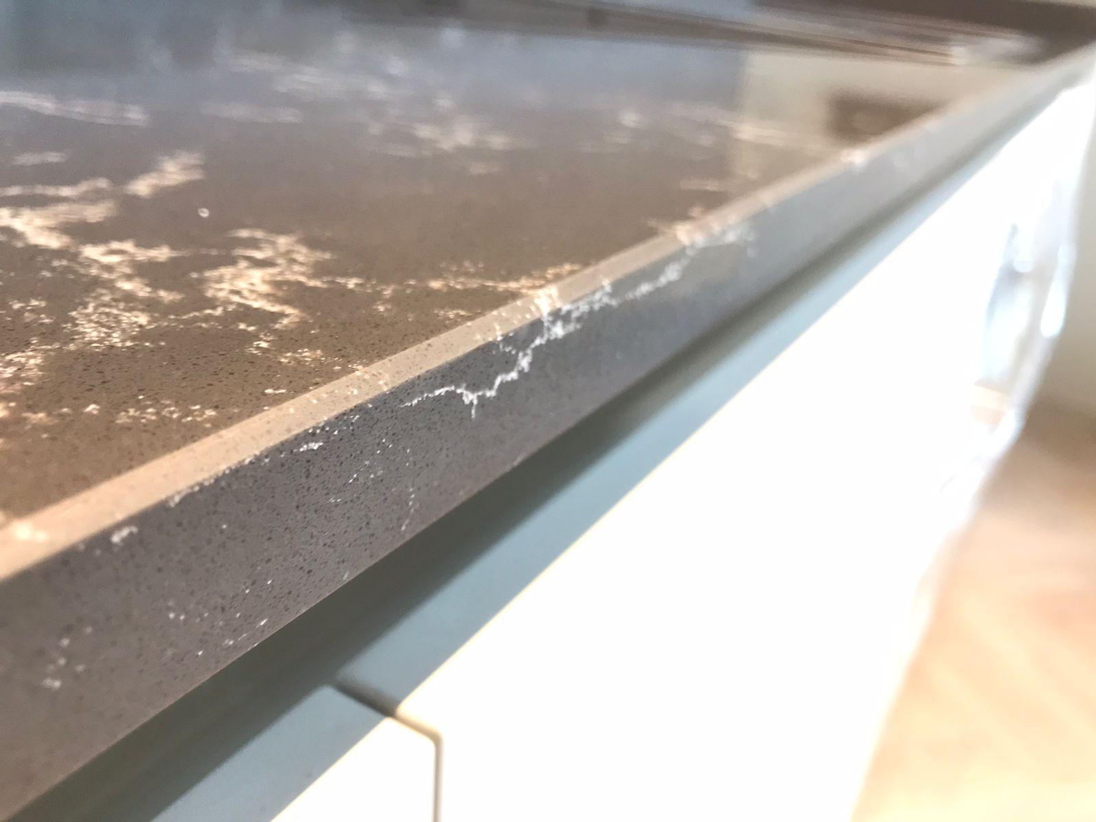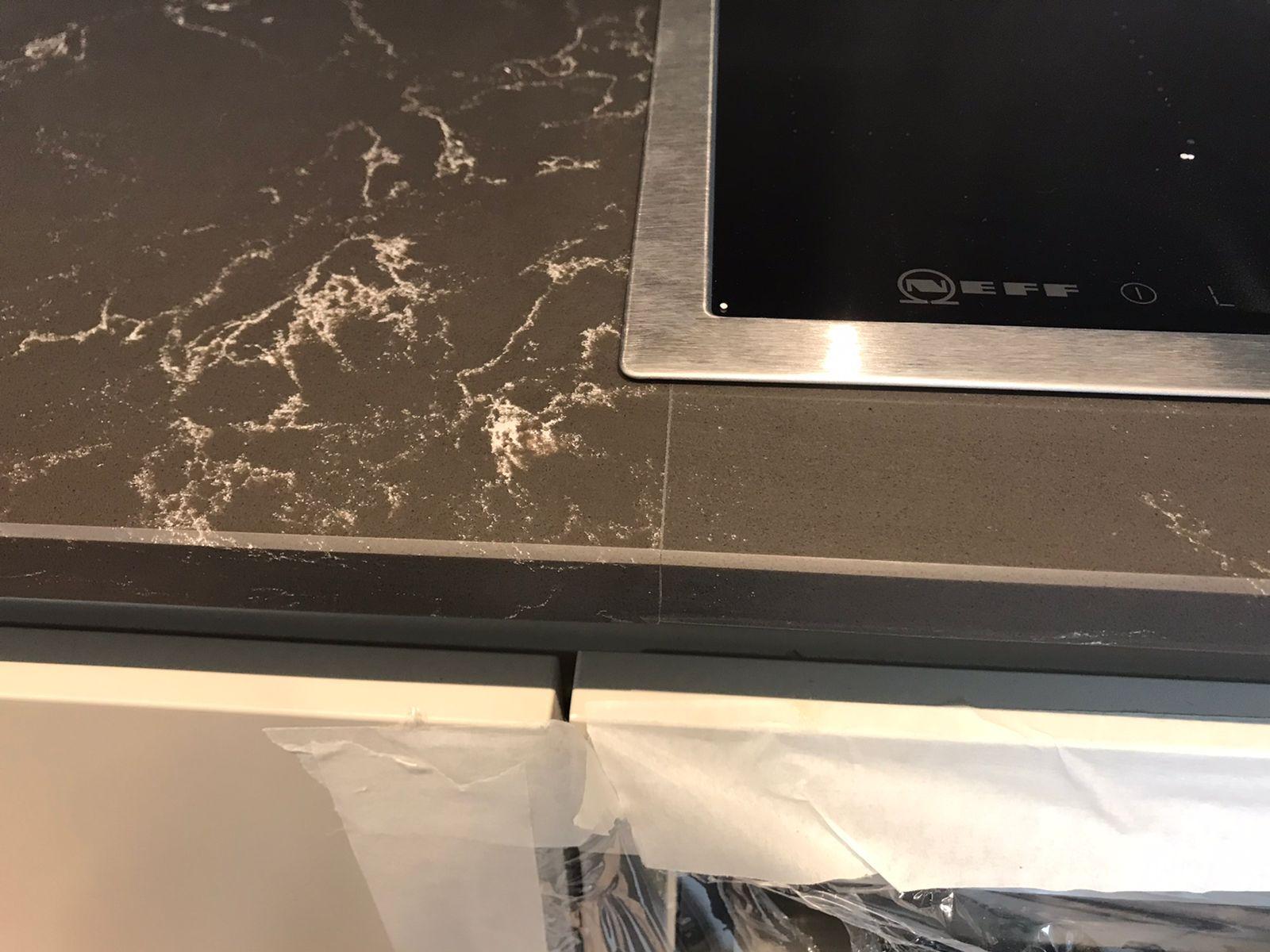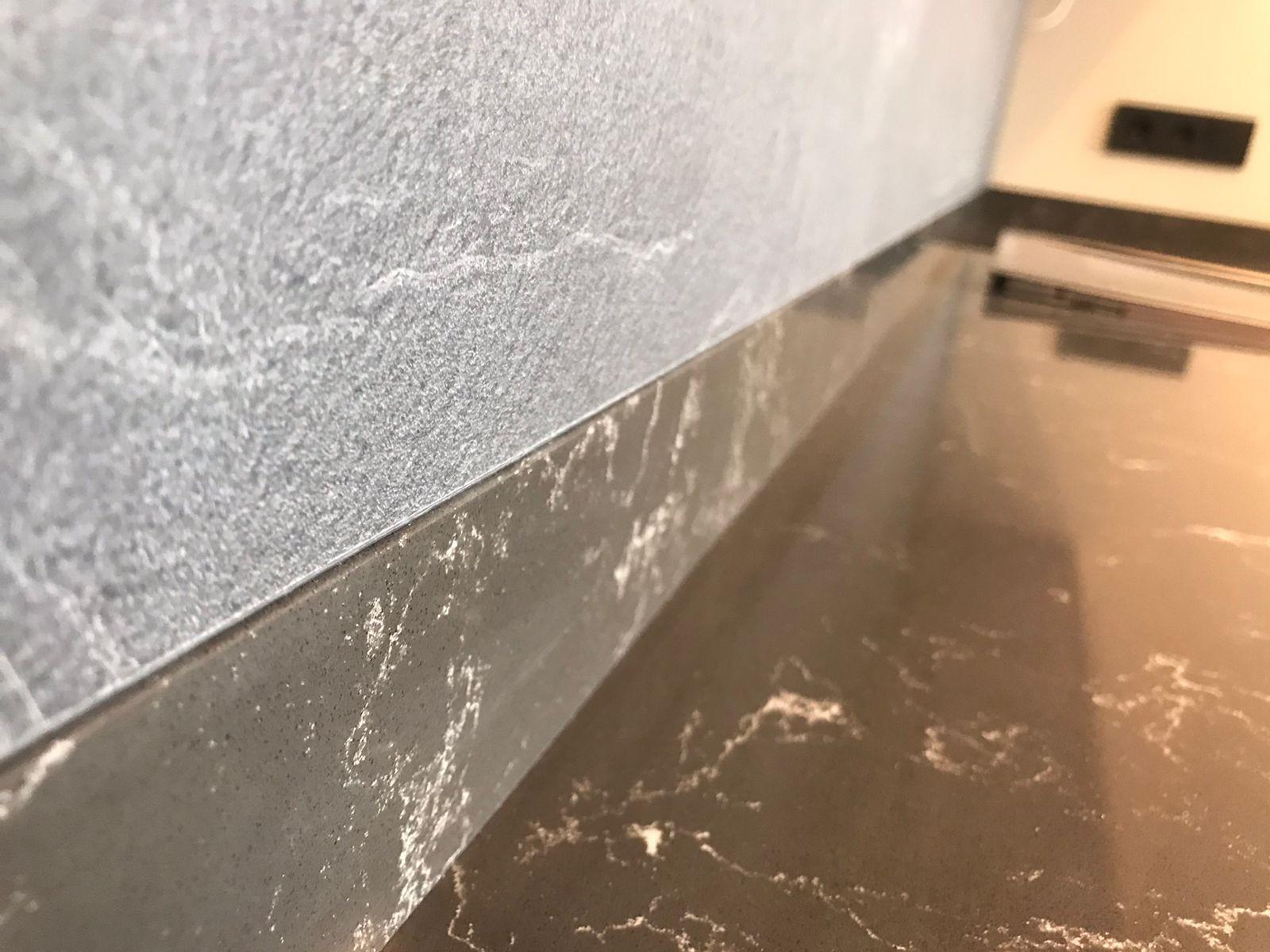 Столешница из кварцевого агломерата, мойка и пристенные плинтусы для кухни