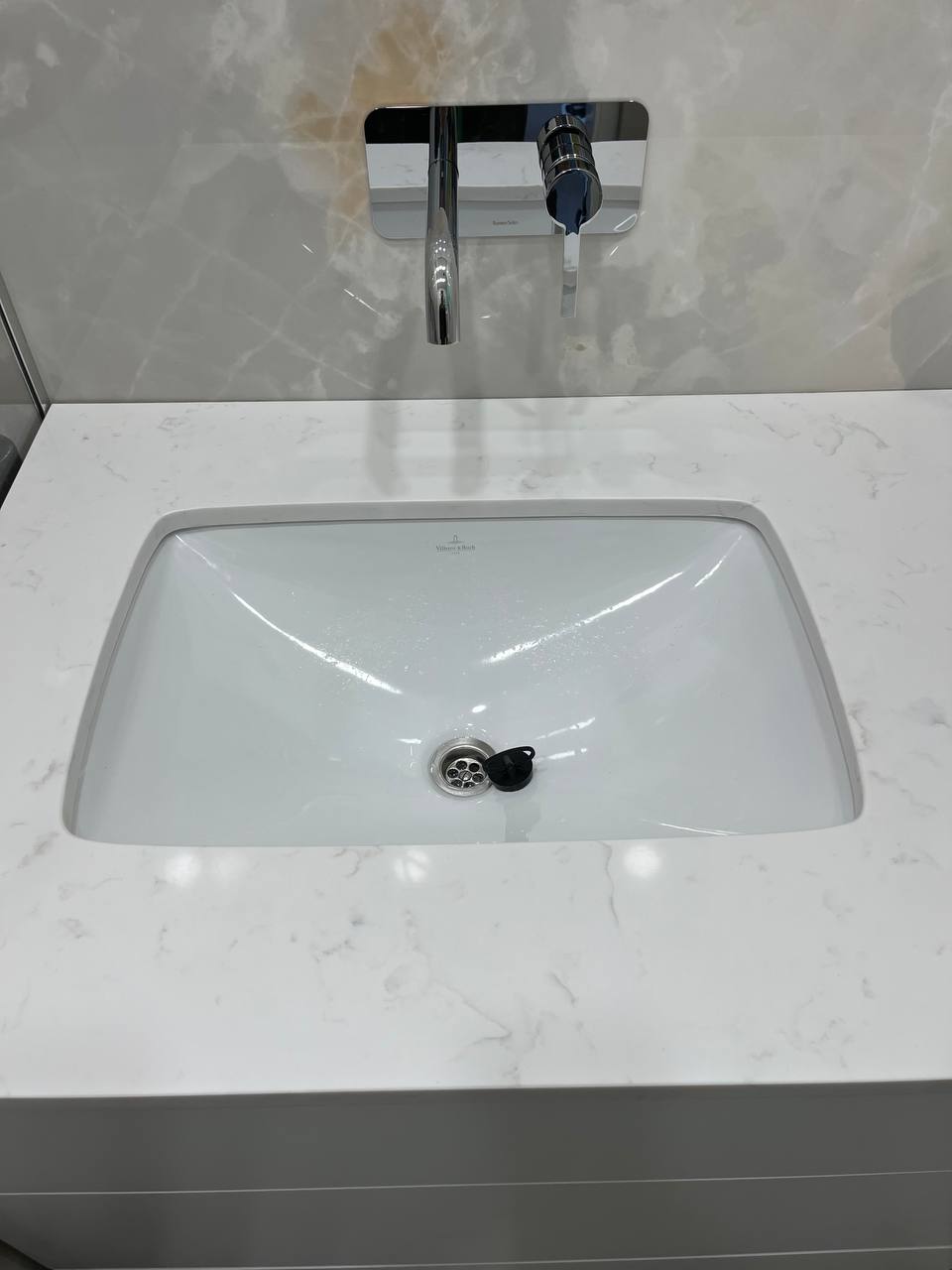 Столешница в ванной комнате выглядит великолепно. Ведь она сделана из кварцевого агломерата Belenco Pixie Wings 1227. Камень белого цвета с мраморным рисунком и мелкими прожилками. Глянцевая поверхность придает ей роскошный вид. Если вам нужна матовая поверхность, сообщите об этом нашему менеджеру.
