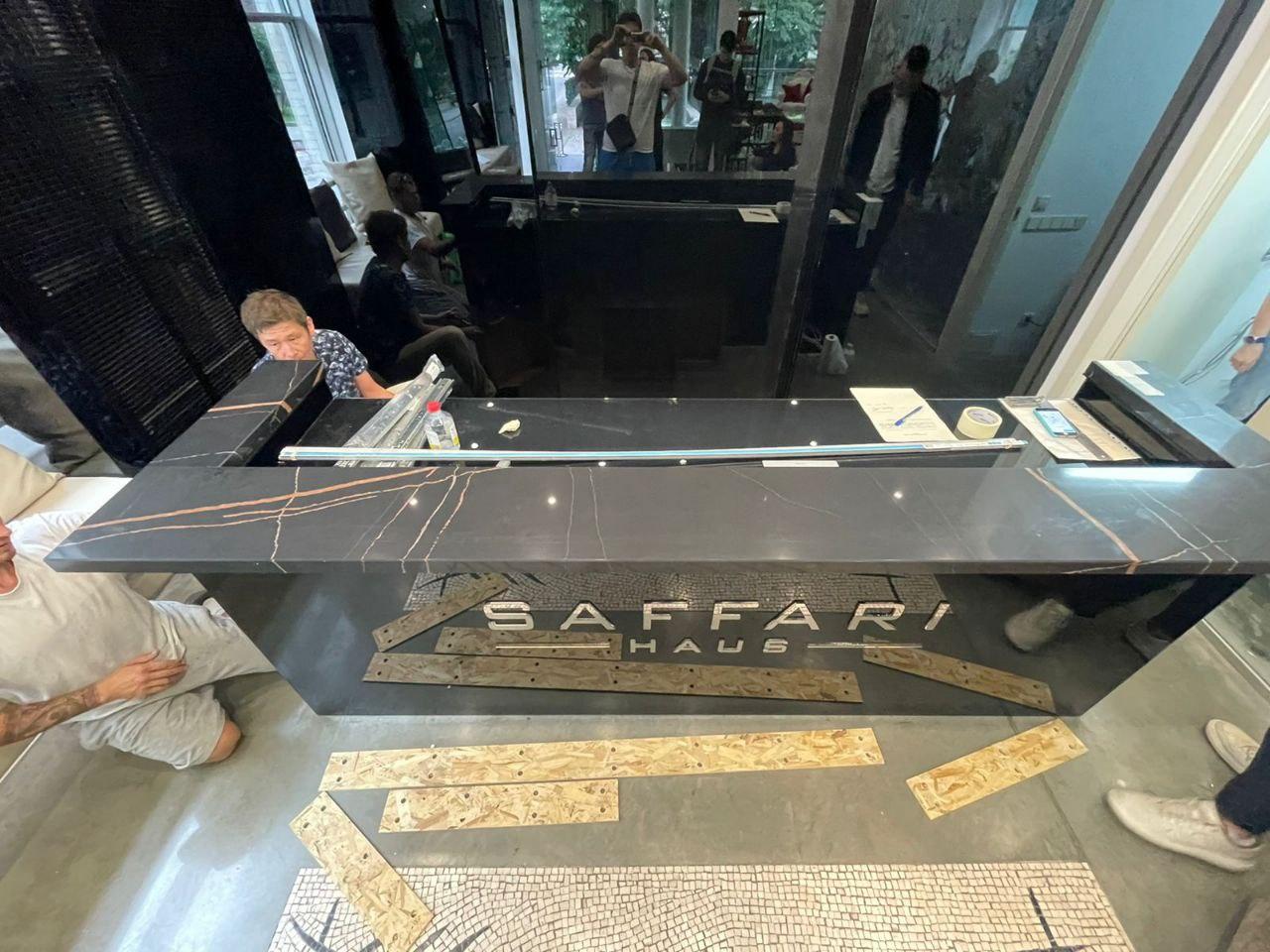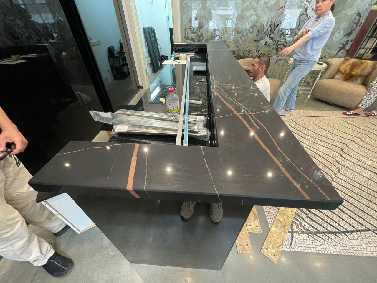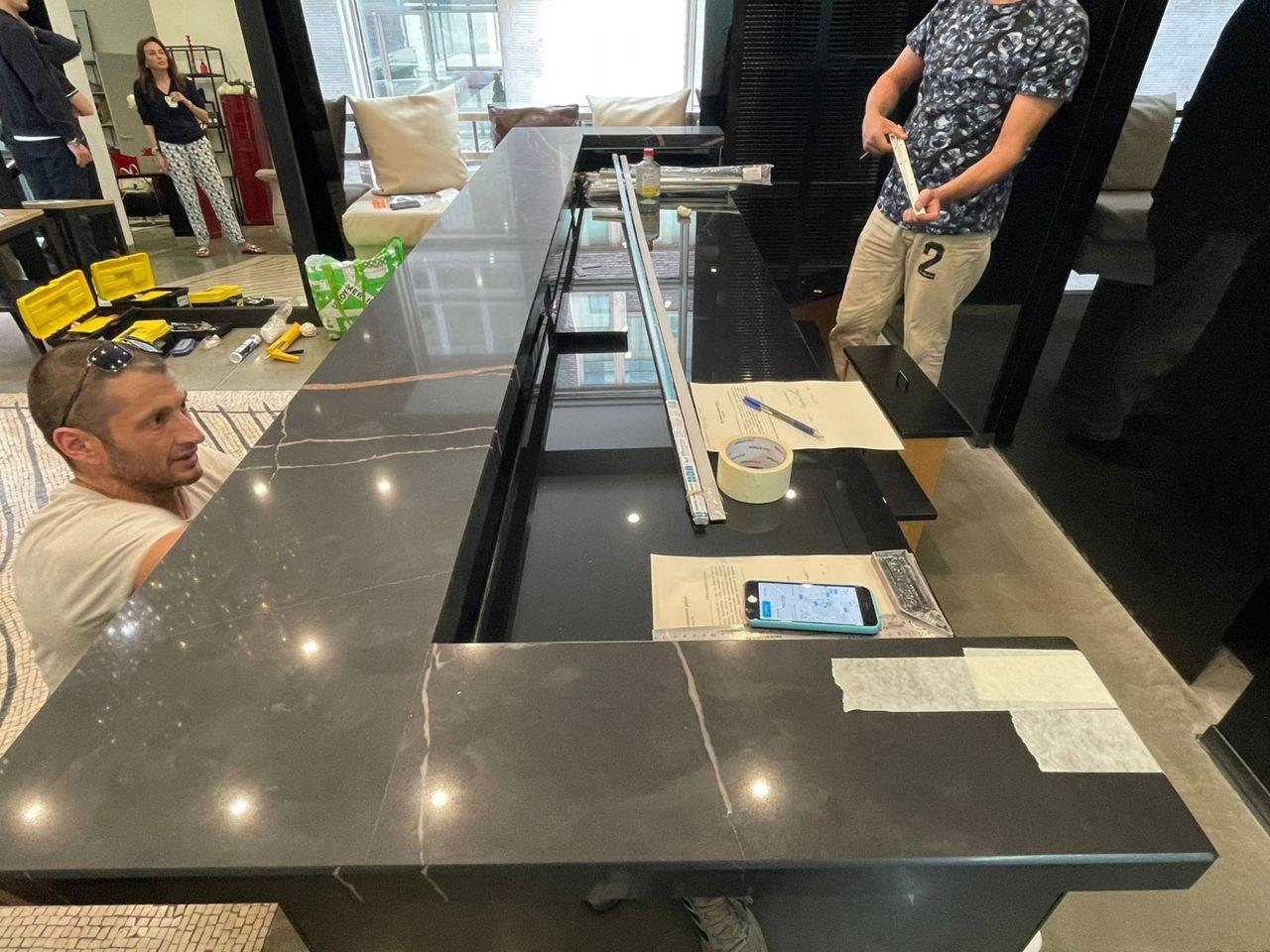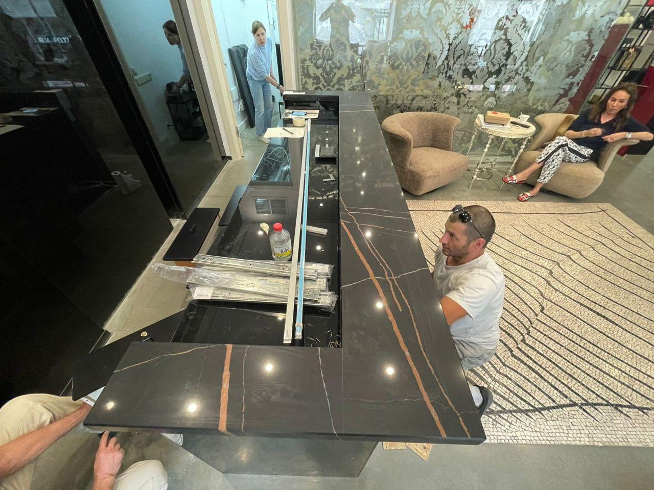 П-образная столешница для ресепшн современного московского торгового центра изготовлена из уникального кварцевого агломерата Avant 7700 Калакатта Марсель с продольными белыми и бежевыми прожилками.