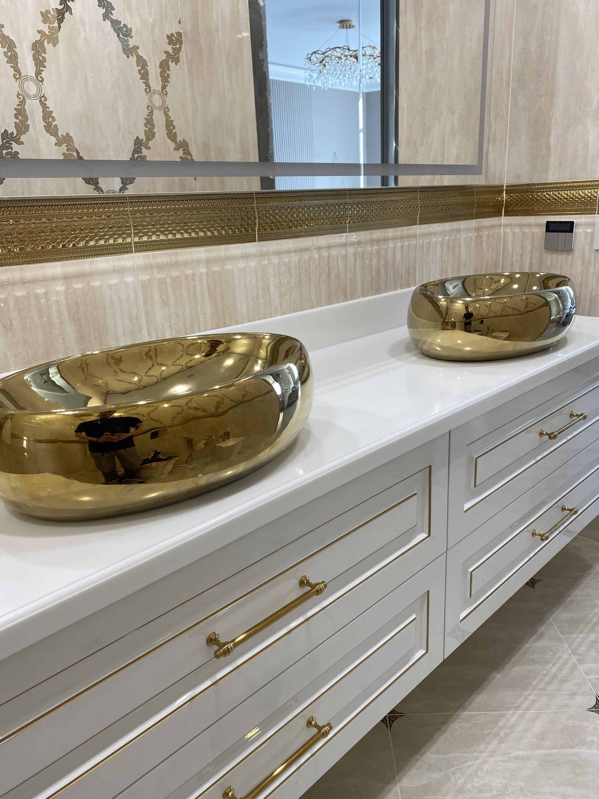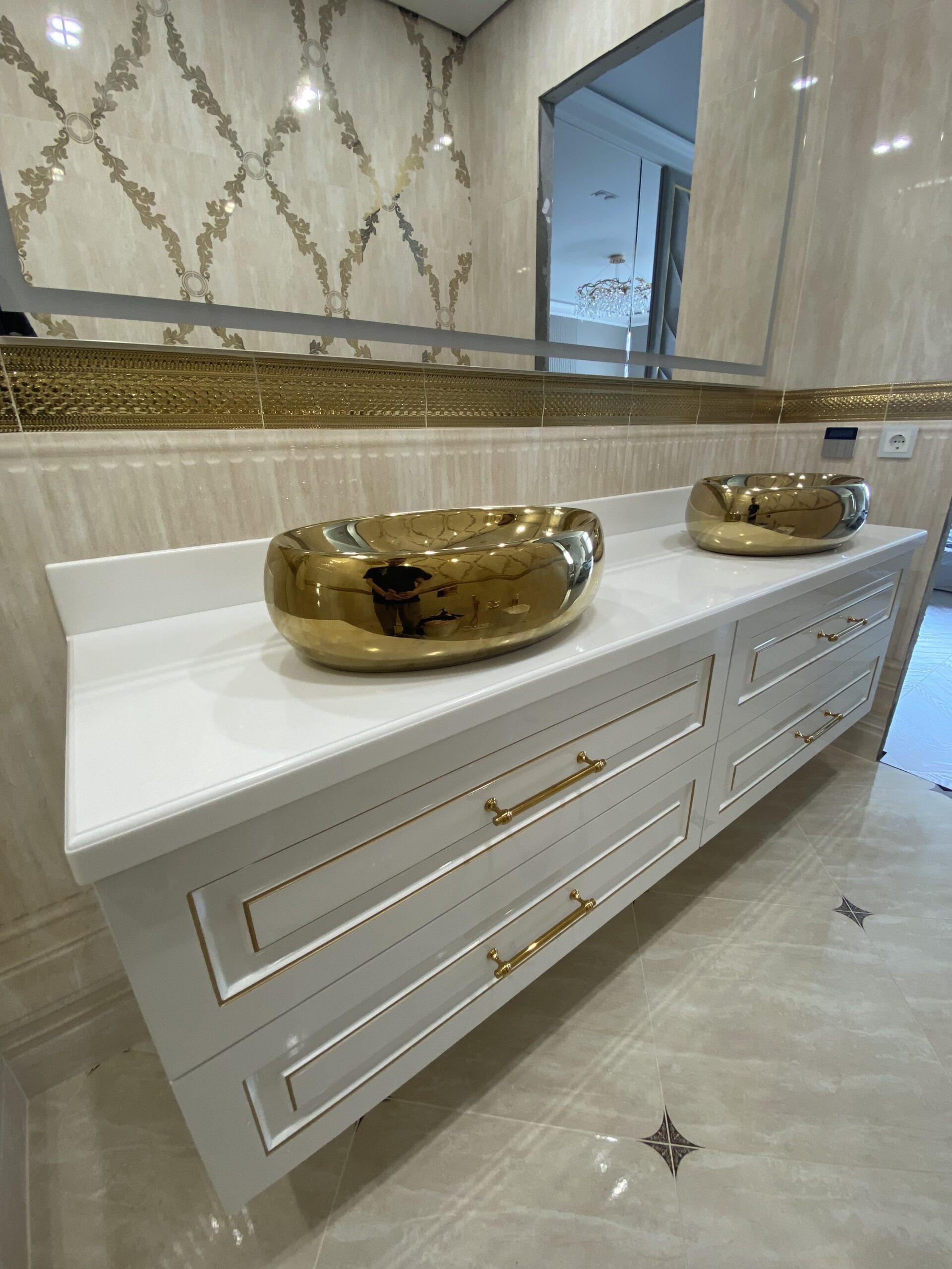 Столешница с фигурной кромкой в ванную из искусственного камня
