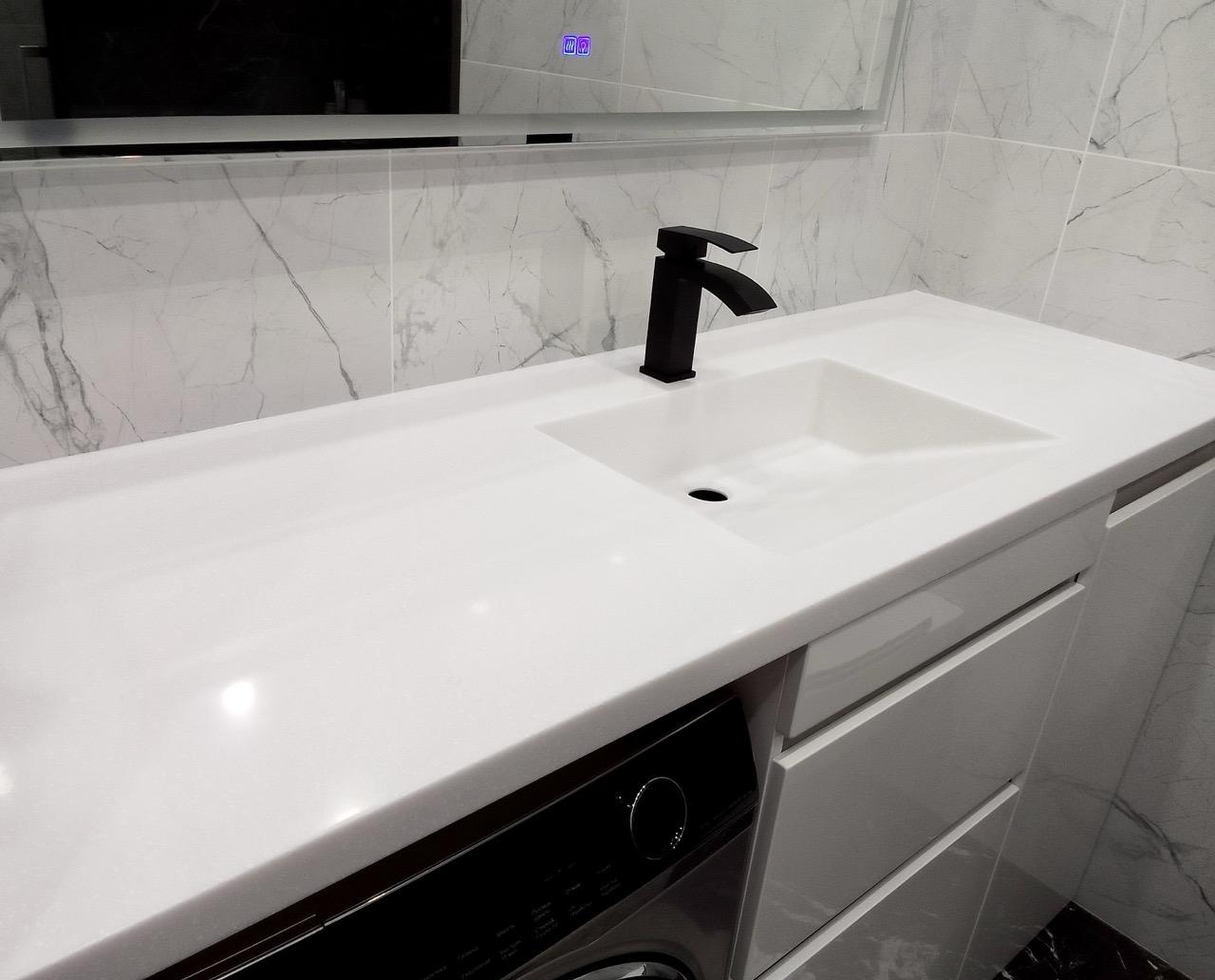 Интегрированная раковина и столешница сделаны из акрилового камня белого цвета Grandex D-314 Arctic Ice. Расцветка с мелкими вкраплениями.