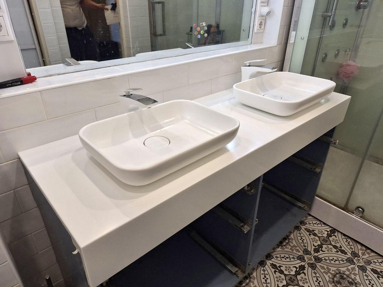 Высокая столешница сделана на тумбу специально под 2 накладные раковины. Их наши мастера также изготовили из акрилового камня, как и саму столешницу.