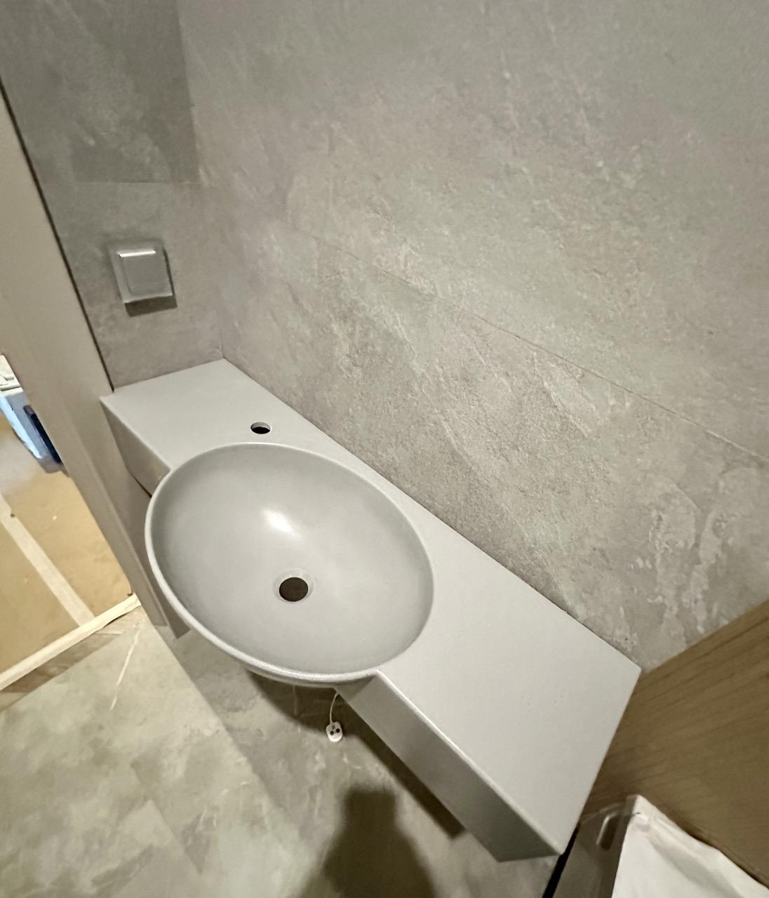 В ванную комнату изготовили столешницу с интегрированной раковиной сложной формы. Акриловый камень — термопластичный, поэтому из него можно изготовить изделия разных форм.