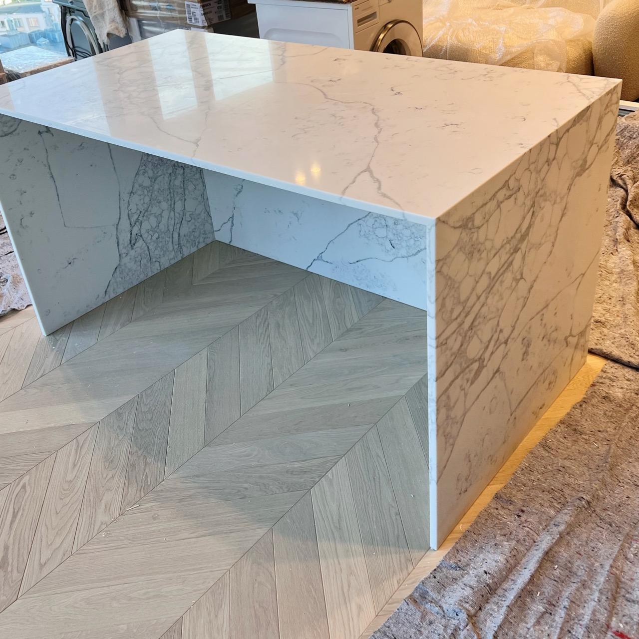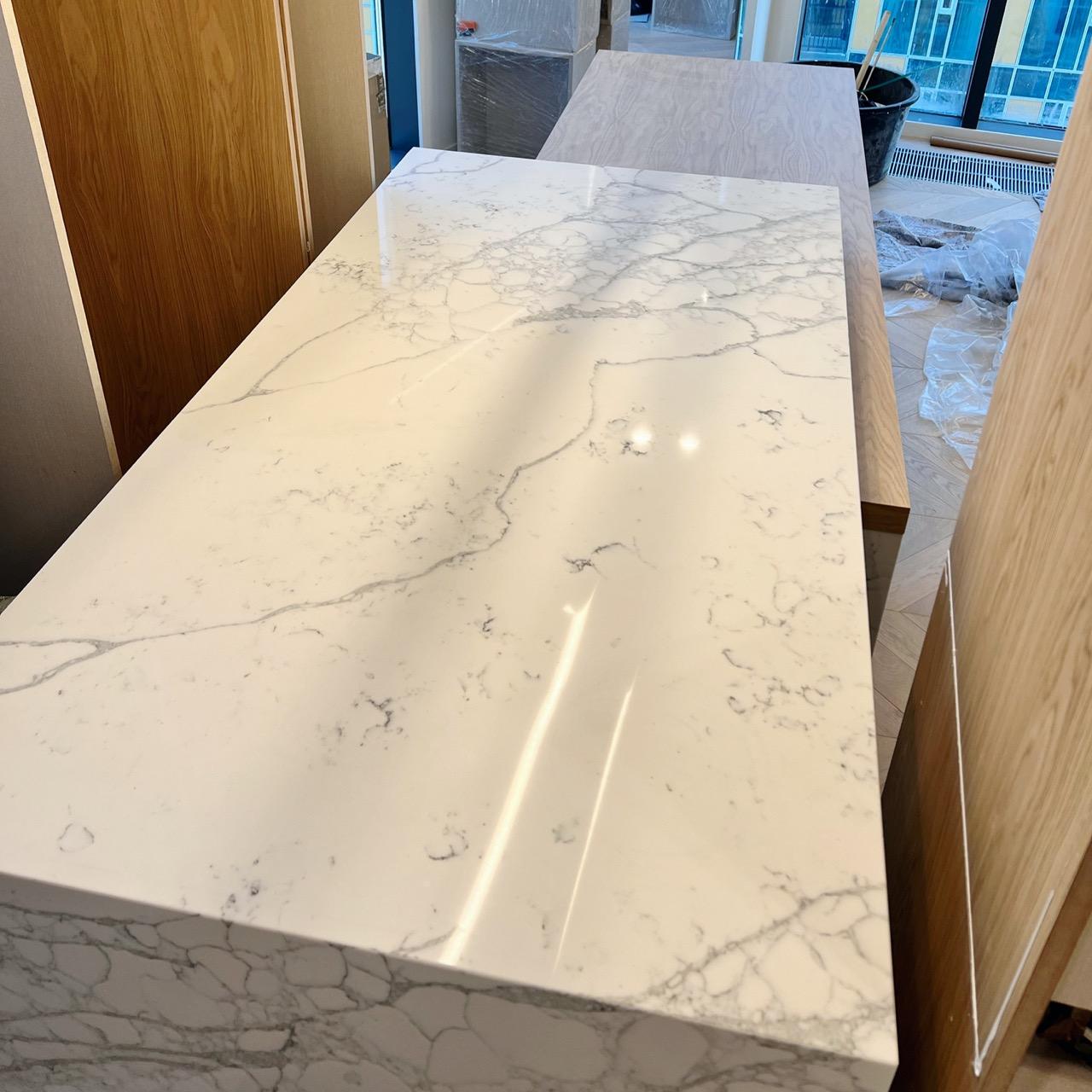 Для изделий выбрали твердый камень светлого цвета – кварцевый агломерат ETNA QUARTZ Arabescato Vagli EQAM 045.