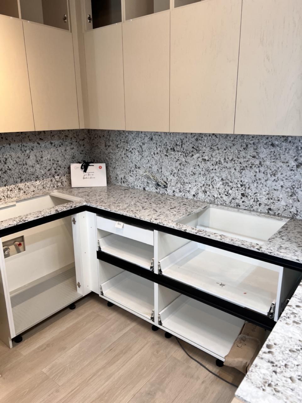 Угловая кварцевая столешница изготовлена из камня с мелкими прожилками Belenco 7353 Pergamon. Бежевый оттенок, наряду с серым, на белом фоне смотрится интересно и он прекрасно подошел к гарнитуру, который также содержит похожие цвета.