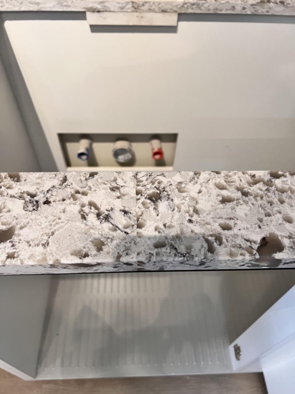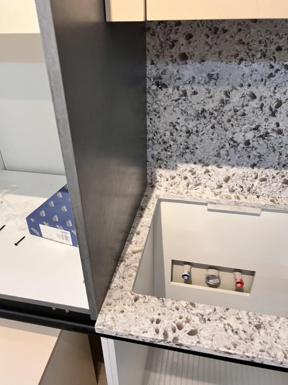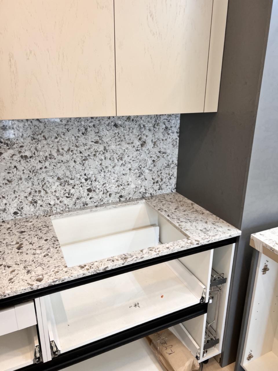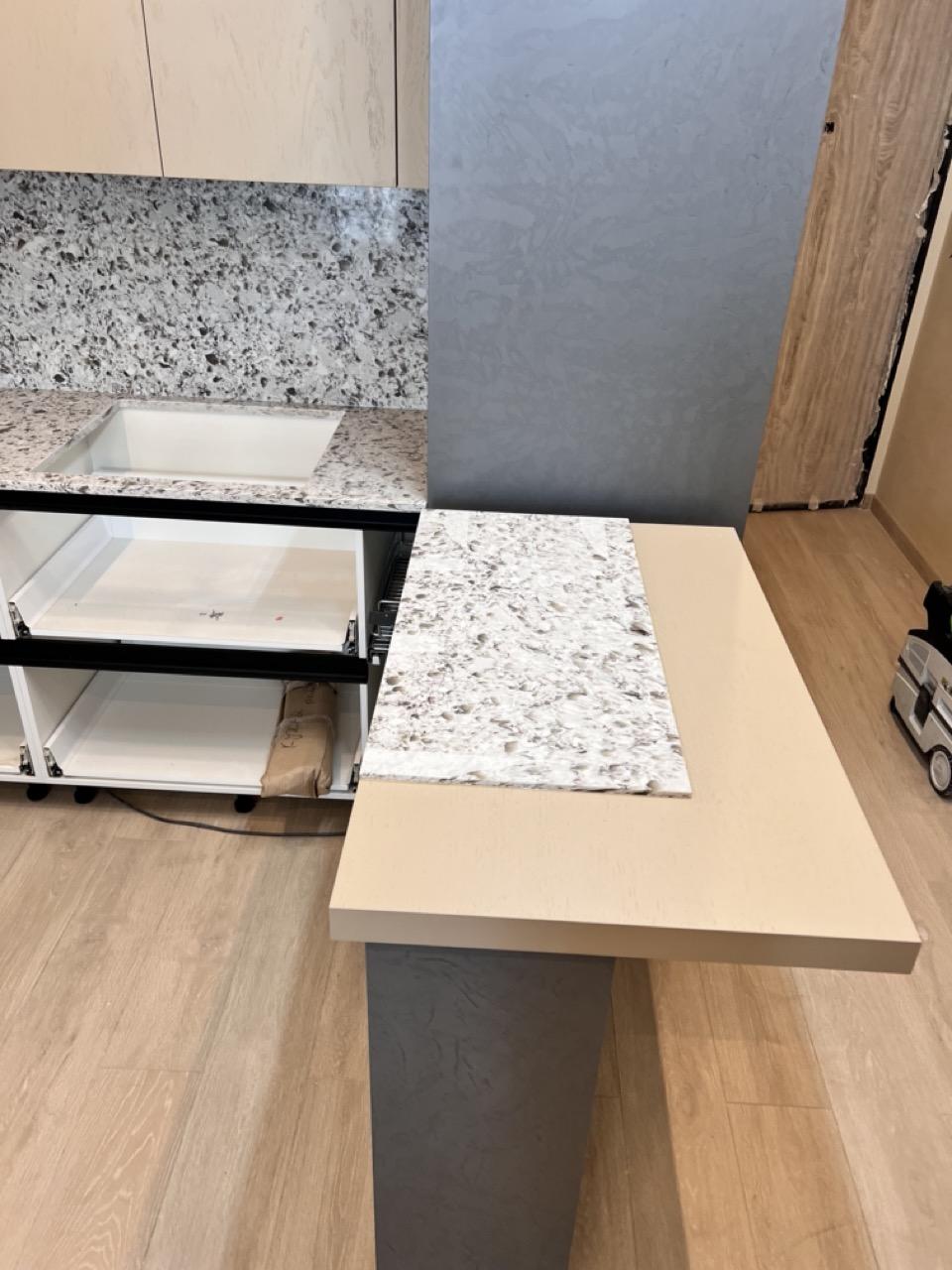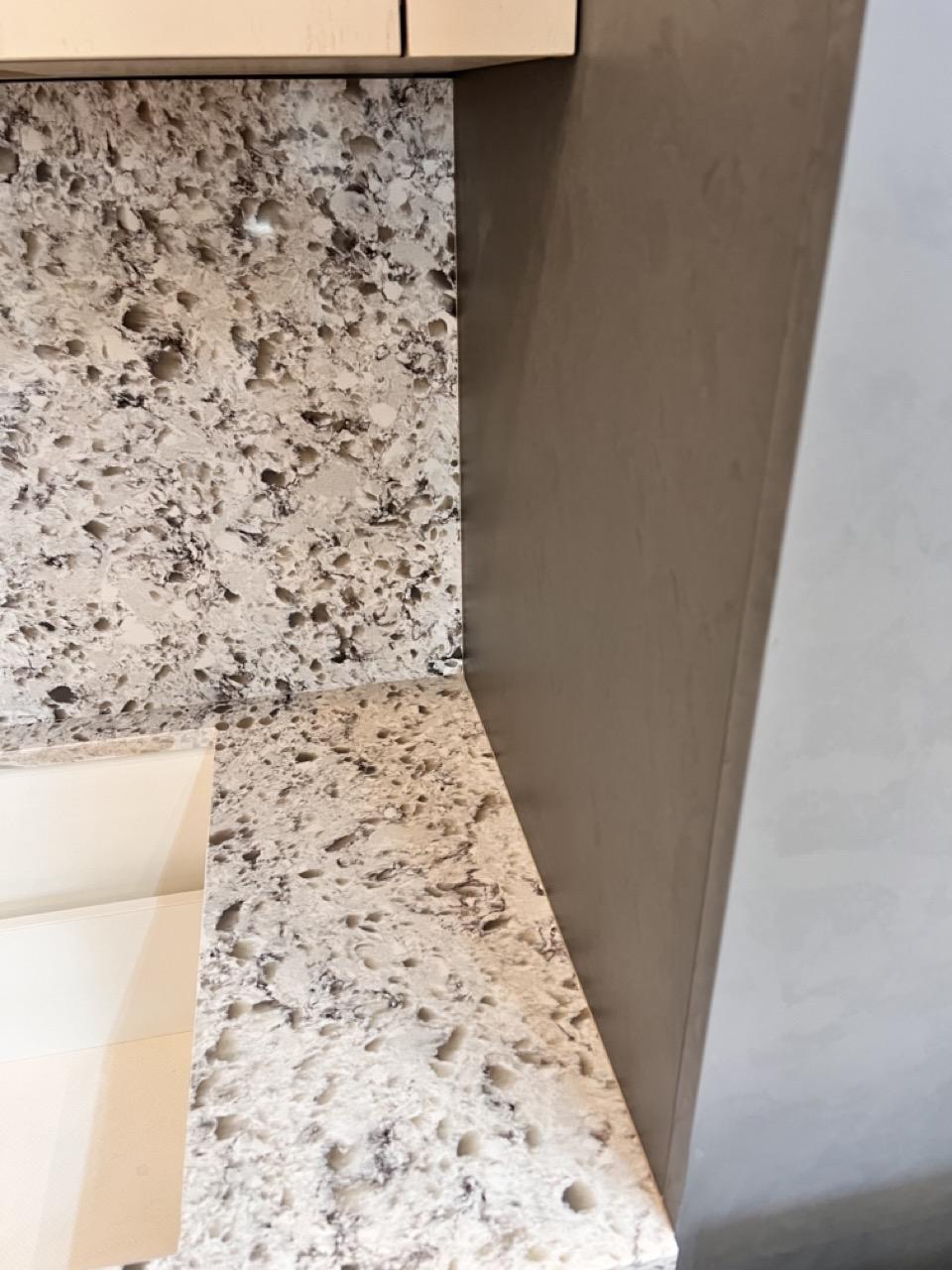 Угловая кварцевая столешница изготовлена из камня с мелкими прожилками Belenco 7353 Pergamon. Бежевый оттенок, наряду с серым, на белом фоне смотрится интересно и он прекрасно подошел к гарнитуру, который также содержит похожие цвета.