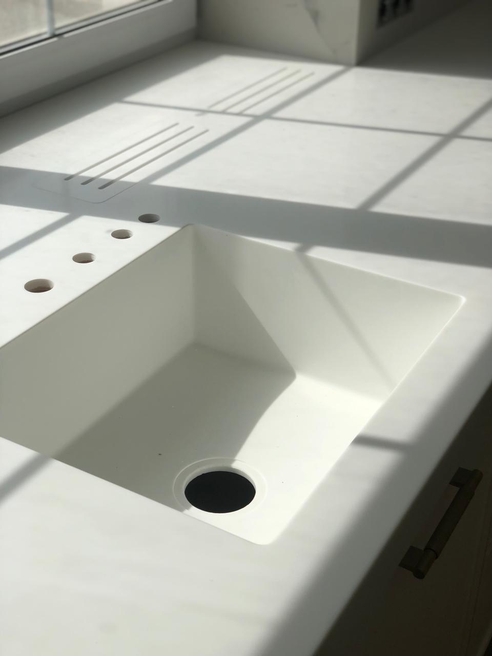 Столешницы для кухонного гарнитура и острова изготовлены из искусственного камня. Столешница на гарнитуре объединена с подоконником. Для обеспечения циркуляции воздуха мастерами нашей компании была изготовлена специальная накладка с вентиляционными вырезами, которую можно легко поднять и протереть от пыли. Кроме того, столешница дополнена интегрированной каменной мойкой. Для изготовления выбран белый однотонный камень - Staron BW010 Bright White с глянцевой поверхностью.