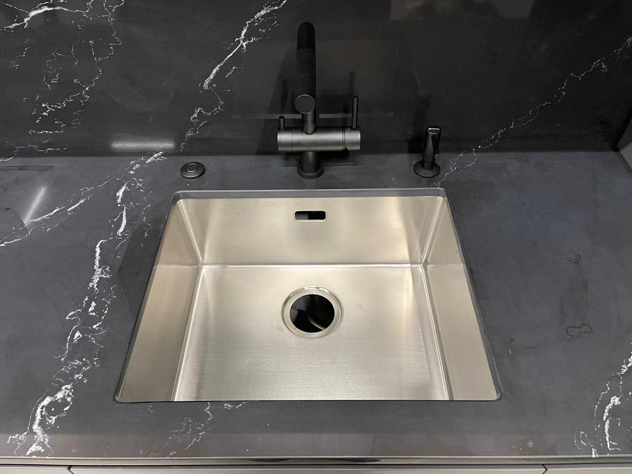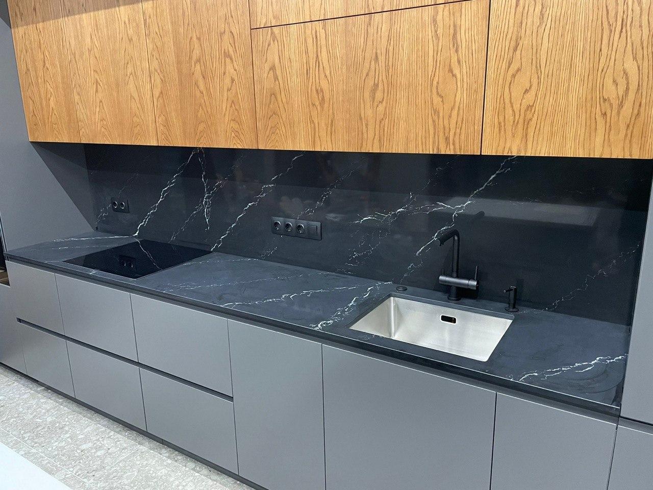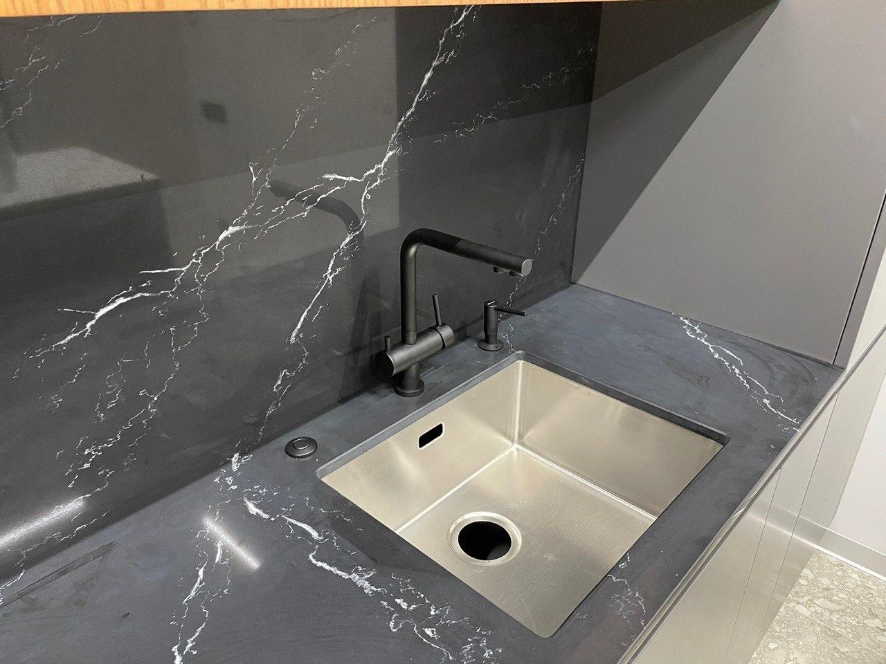 Это классическое сочетание белого и черного камня всегда актуально и прекрасно вписывается в современный интерьер. Обе столешницы имеют мраморный рисунок с крупными и выразительными прожилками. Фартук также выполнен из того же черного камня, что и столешница, и наши мастера умело соединили прожилки фартука с прожилками столешницы, создавая плавный переход.