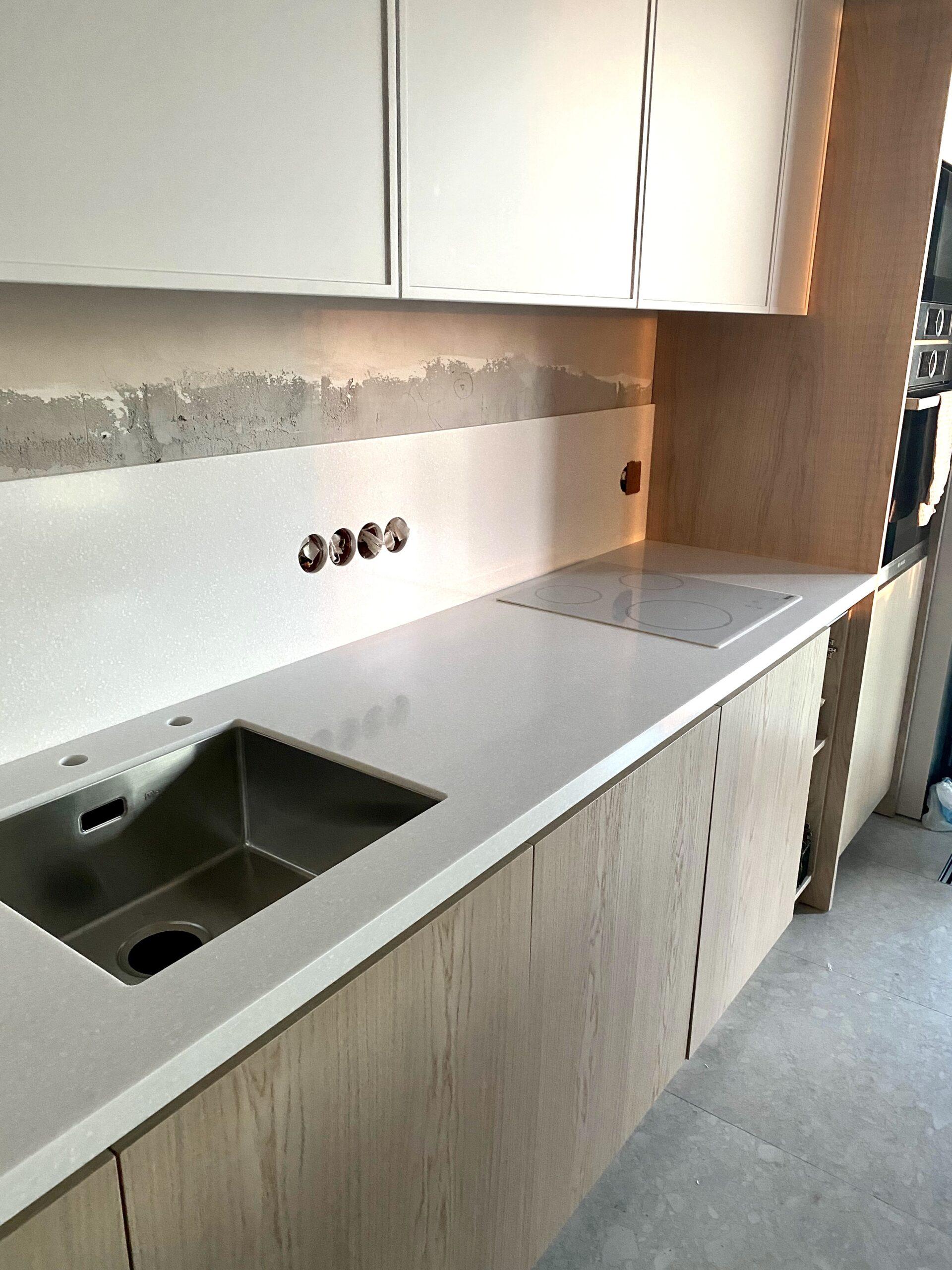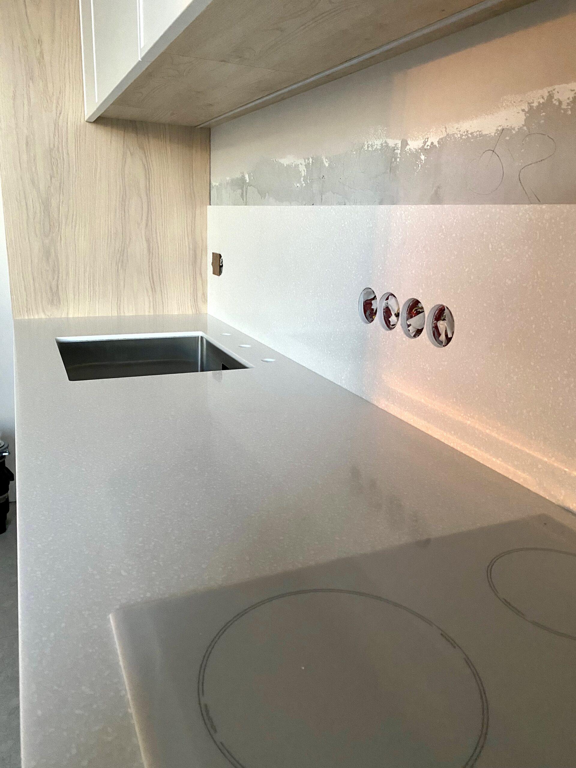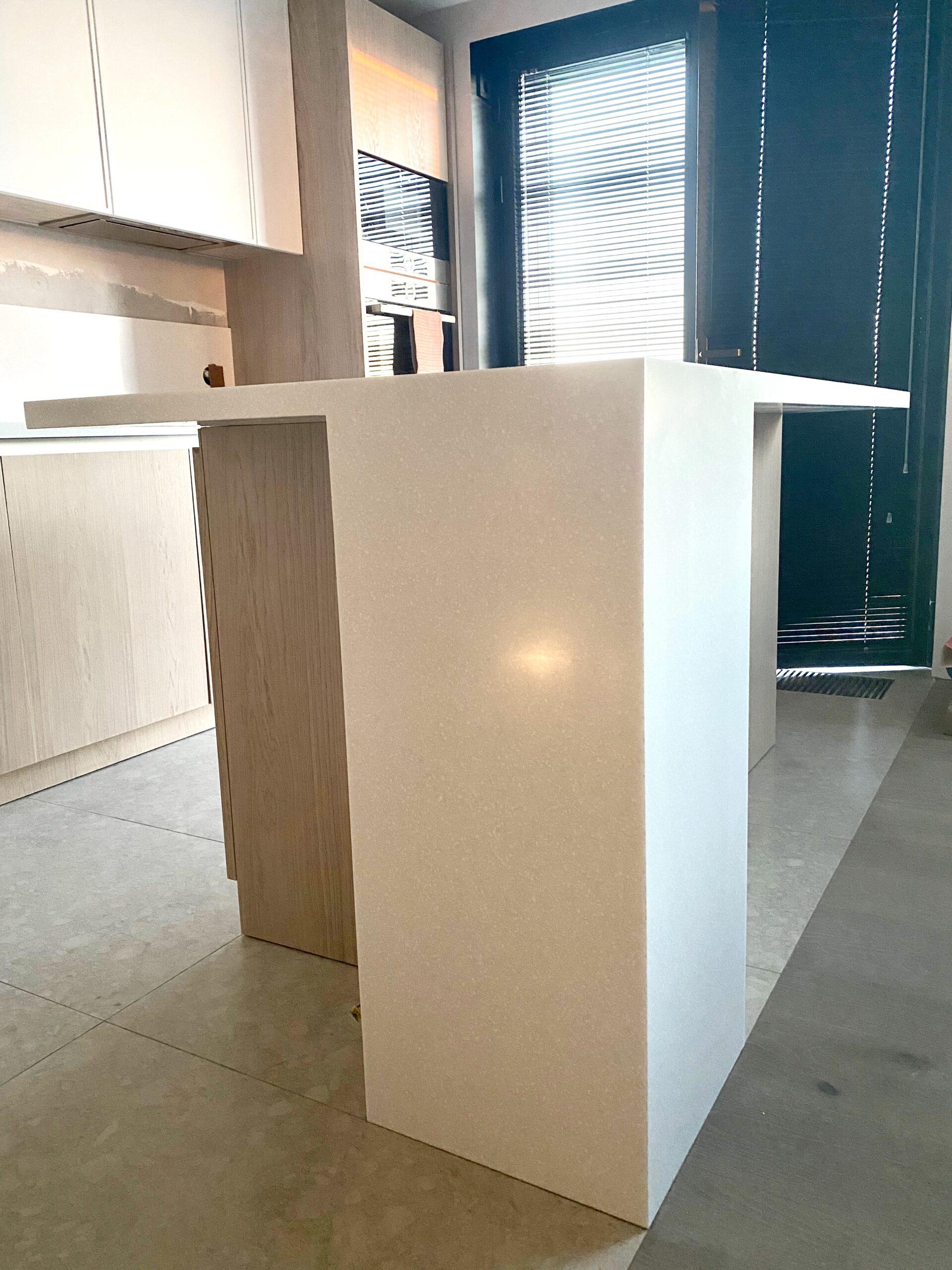 Низкий фартук также заказали из акрилового камня. Цвет для всех изделий выбрали один - Hi-Macs G034 Arctic Granite.
