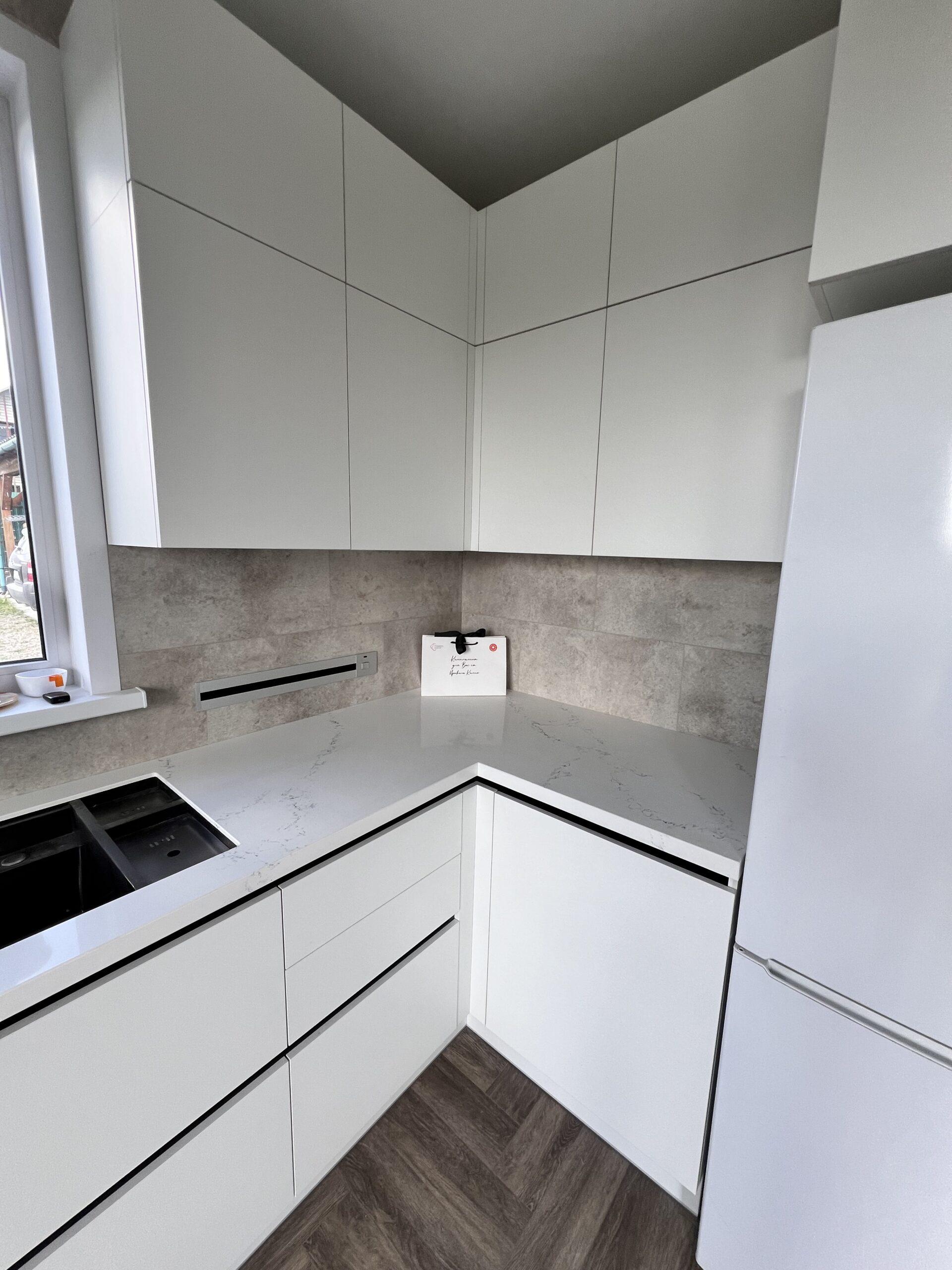 Угловая столешница на кухню сделана из кварцевого агломерата белого цвета с мраморным рисунком - Avant 7020 Калакатта Амбуаз.