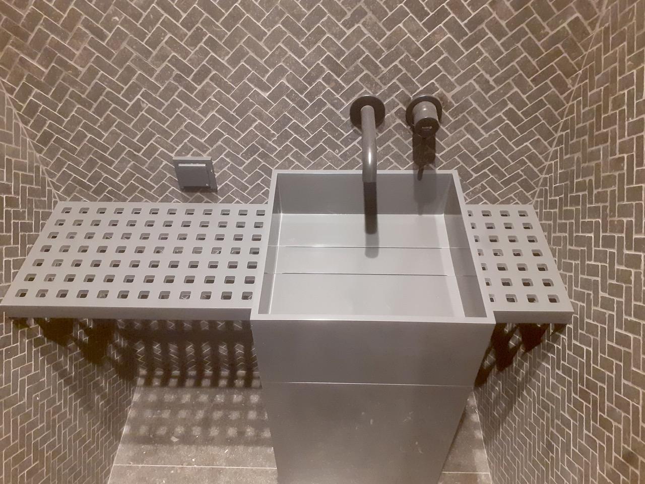 Тумба в ванную комнату изготовлена из серого акрилового камня Grandex P-110 Iron.
