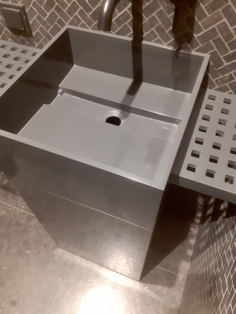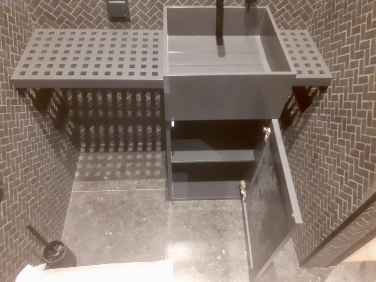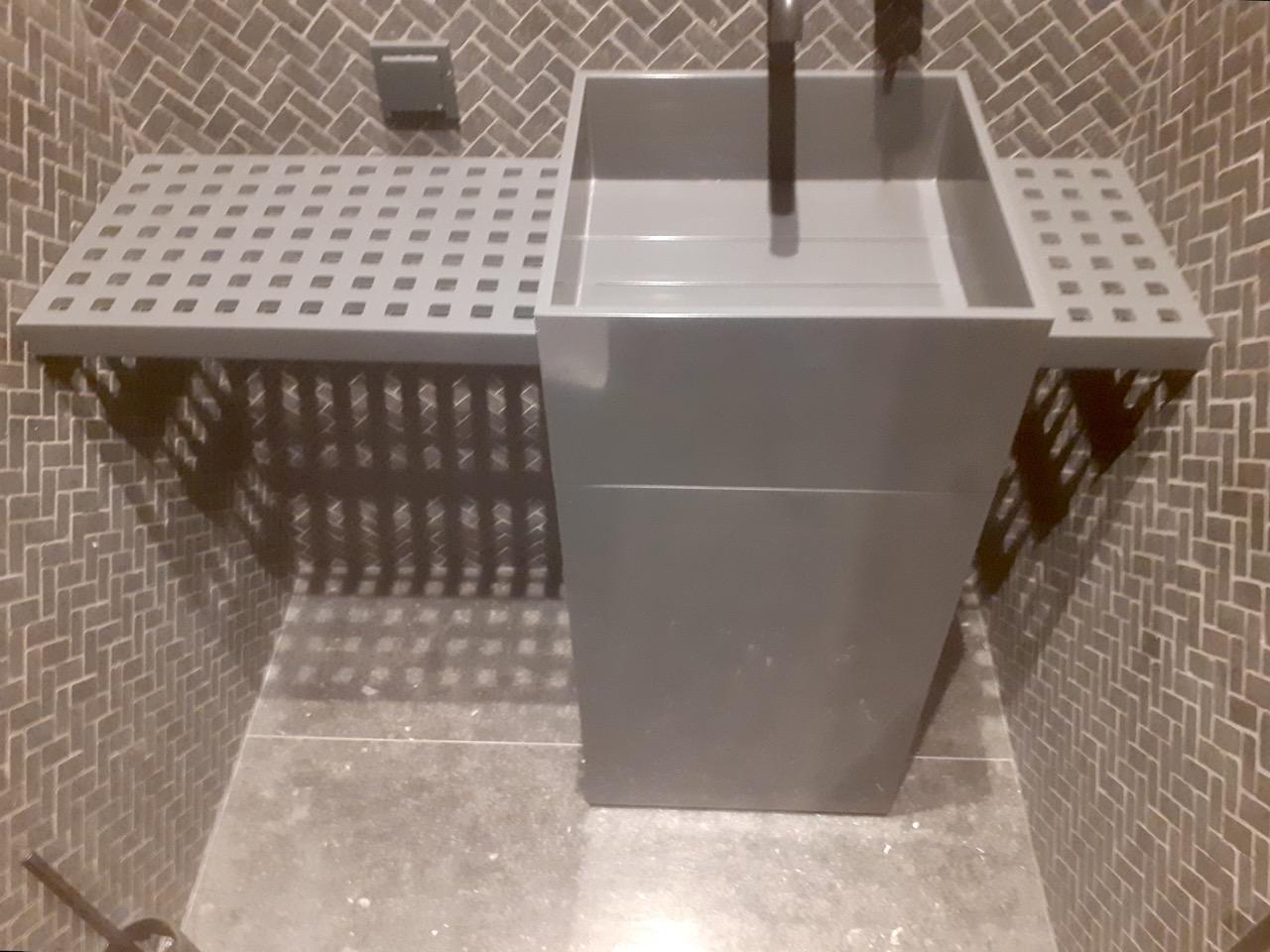 Тумба в ванную комнату изготовлена из серого акрилового камня Grandex P-110 Iron.