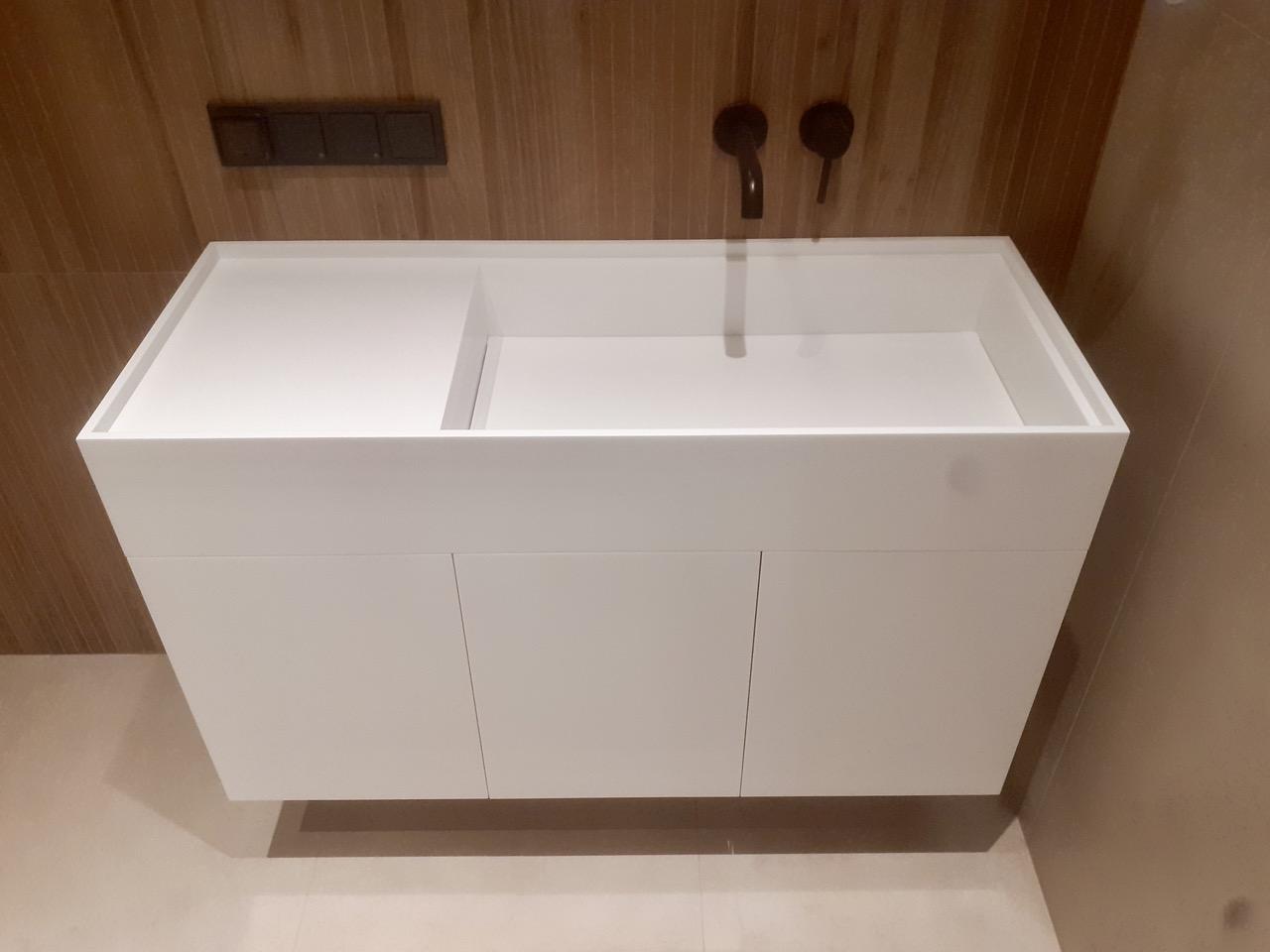 Тумба и интегрированная раковина сделаны из белого однотонного акрилового камня Grandex P-104 Pure White.