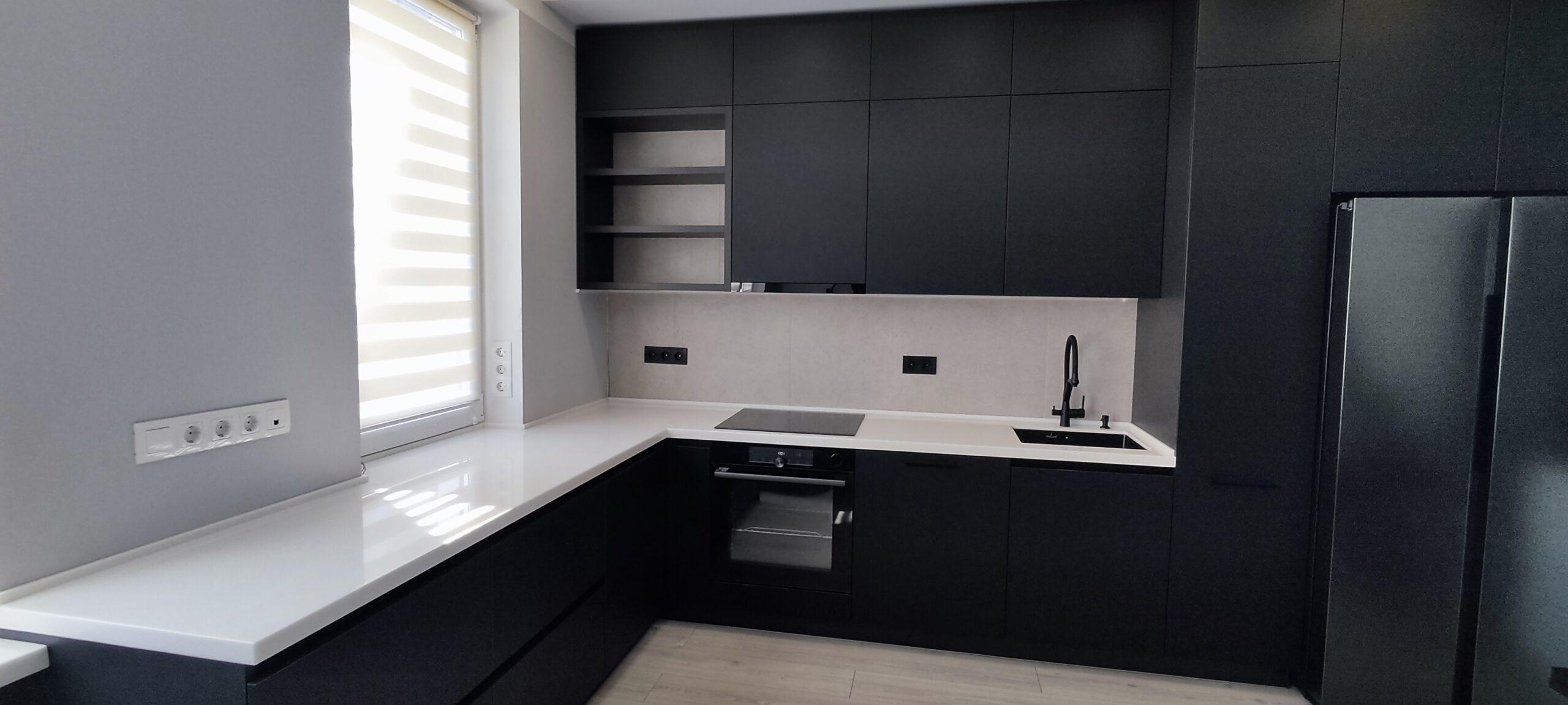 Бесшовная угловая столешница изготовлена из акрилового камня - Hanex D-211 Milk Froth. Бренд от южнокорейского конгломерата Hyundai.