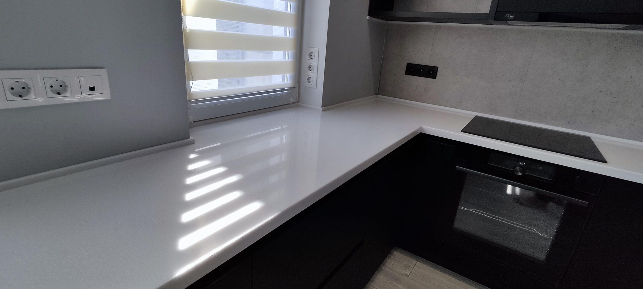 Угловая бесшовная столешница с подоконником из акрилового камня