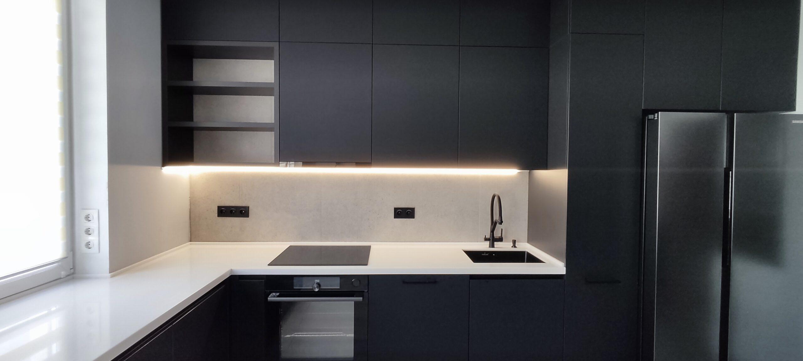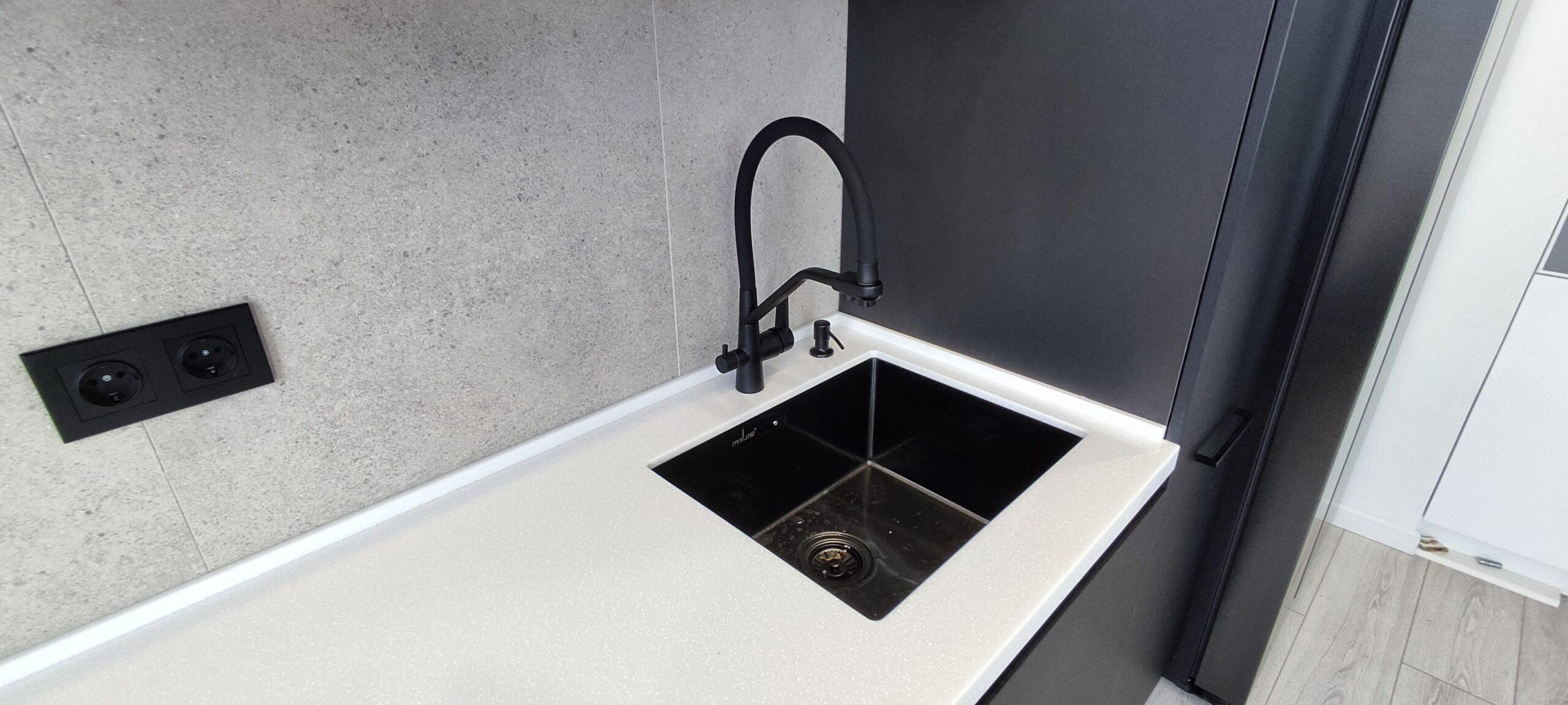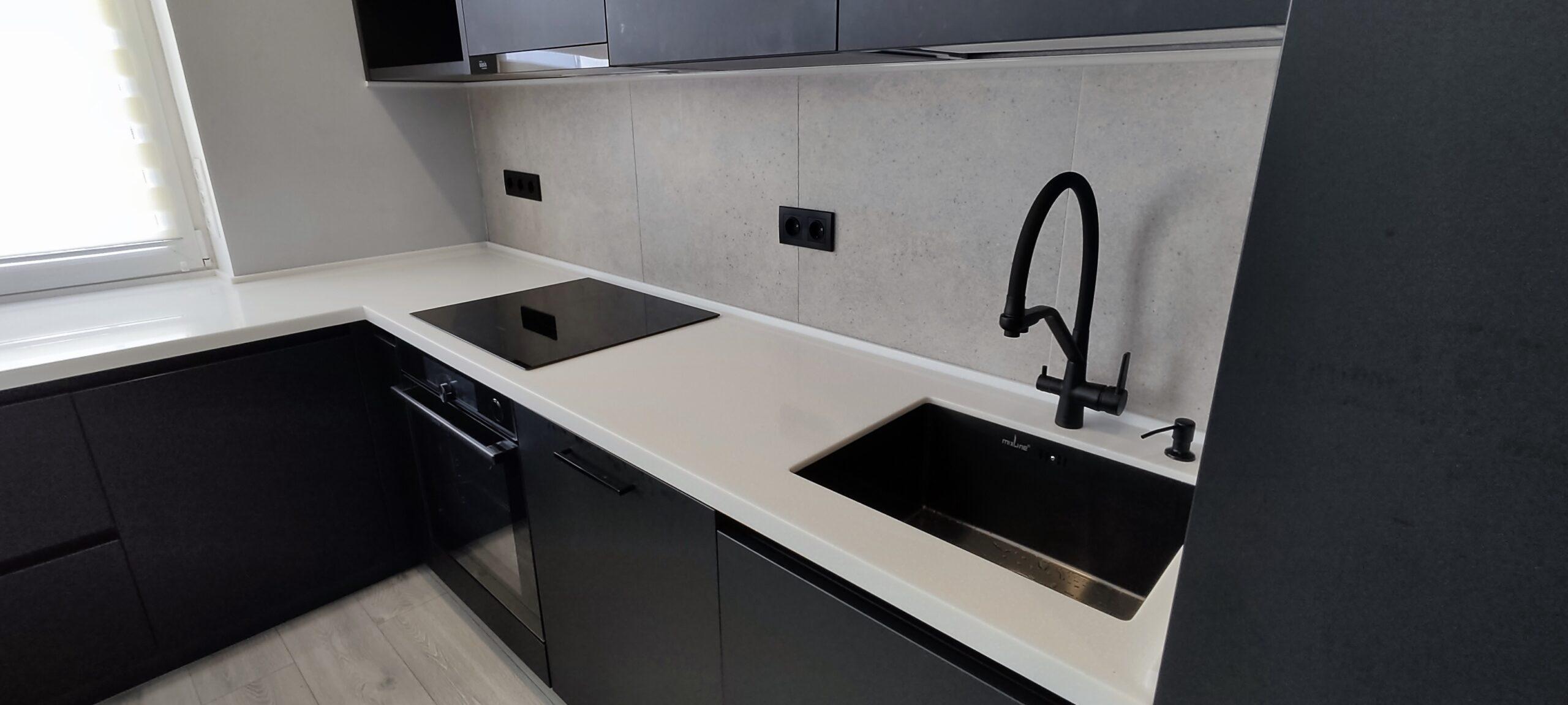 Бесшовная угловая столешница изготовлена из акрилового камня - Hanex D-211 Milk Froth. Бренд от южнокорейского конгломерата Hyundai.