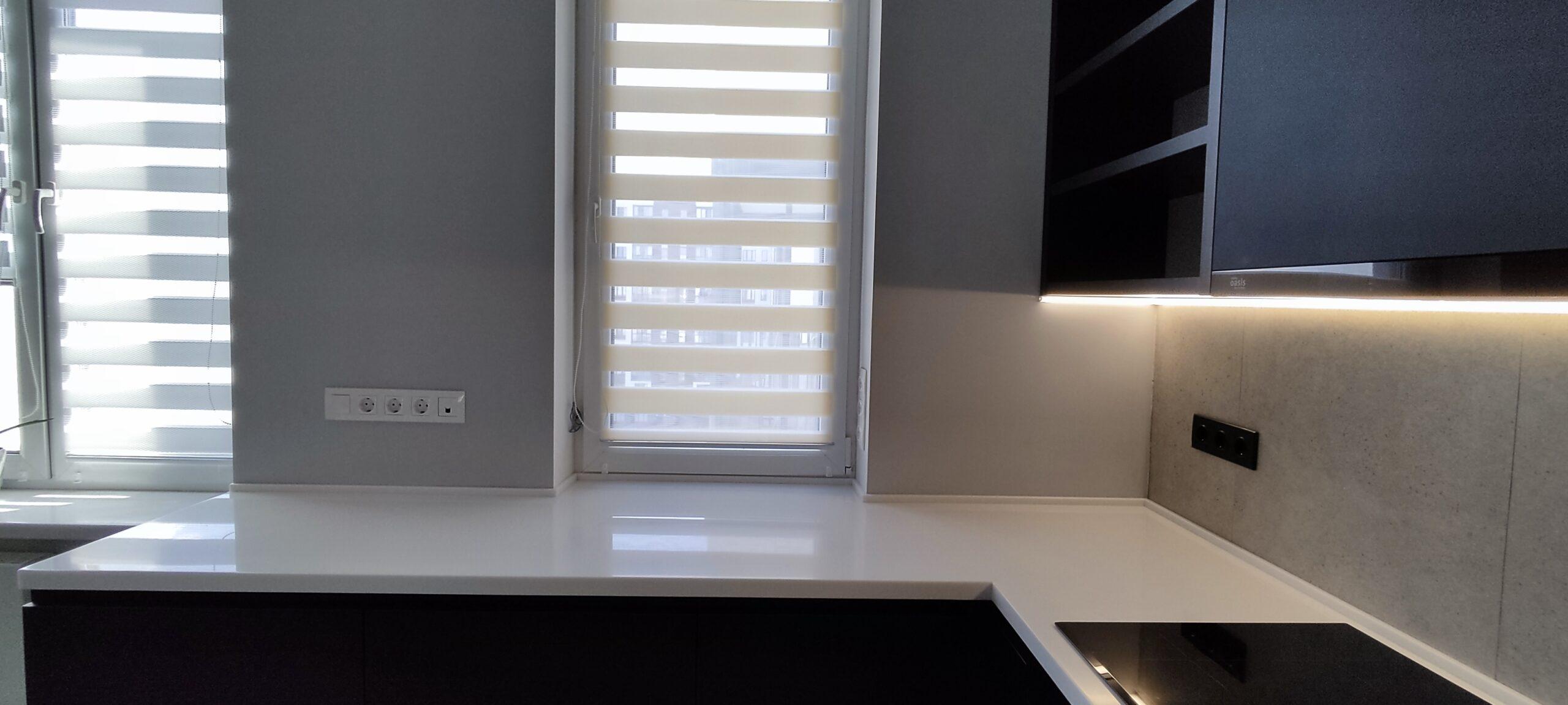 Подоконник объединен со столешницей: получилось больше рабочего места. Камень белого цвета со светлыми вкраплениями - смотрится необычно и немного празднично.