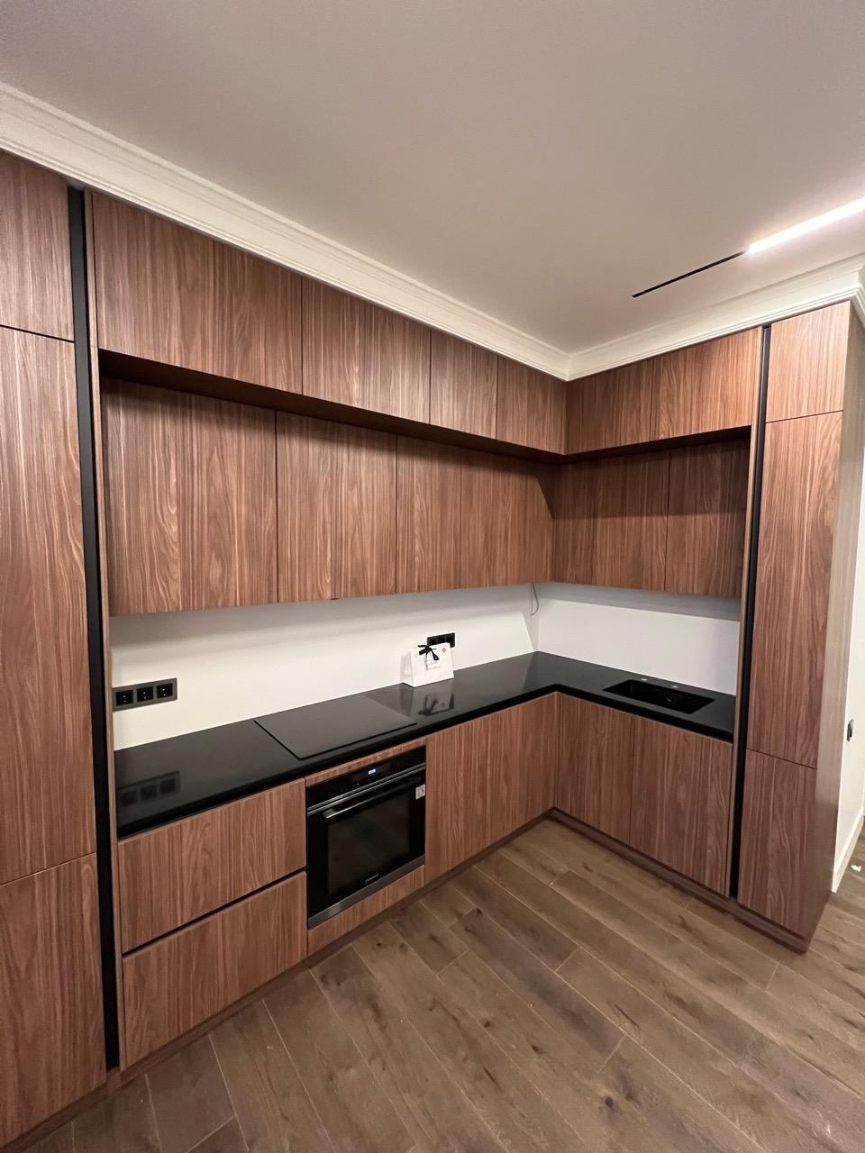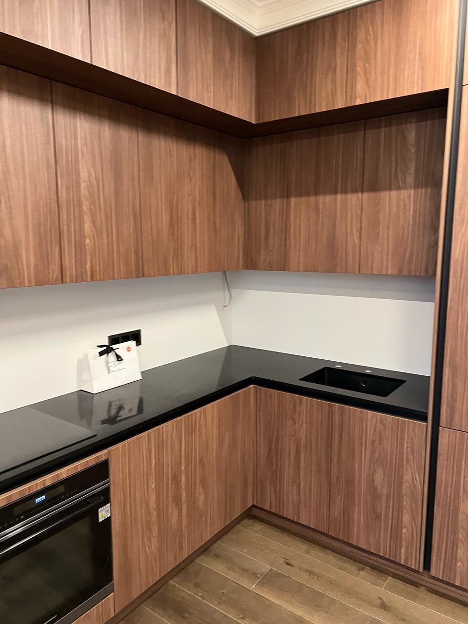 Угловая столешница сделана из кварцевого агломерата черного цвета. Avarus — камень российского бренда. Поэтому стоимость выгоднее зарубежных аналогов на 20-25%.