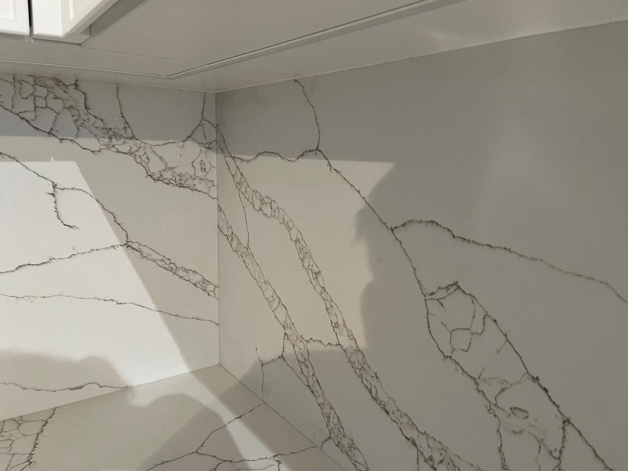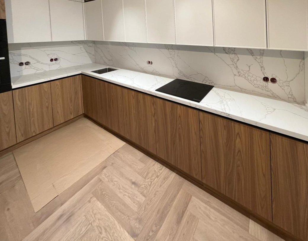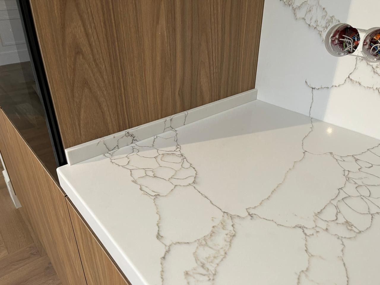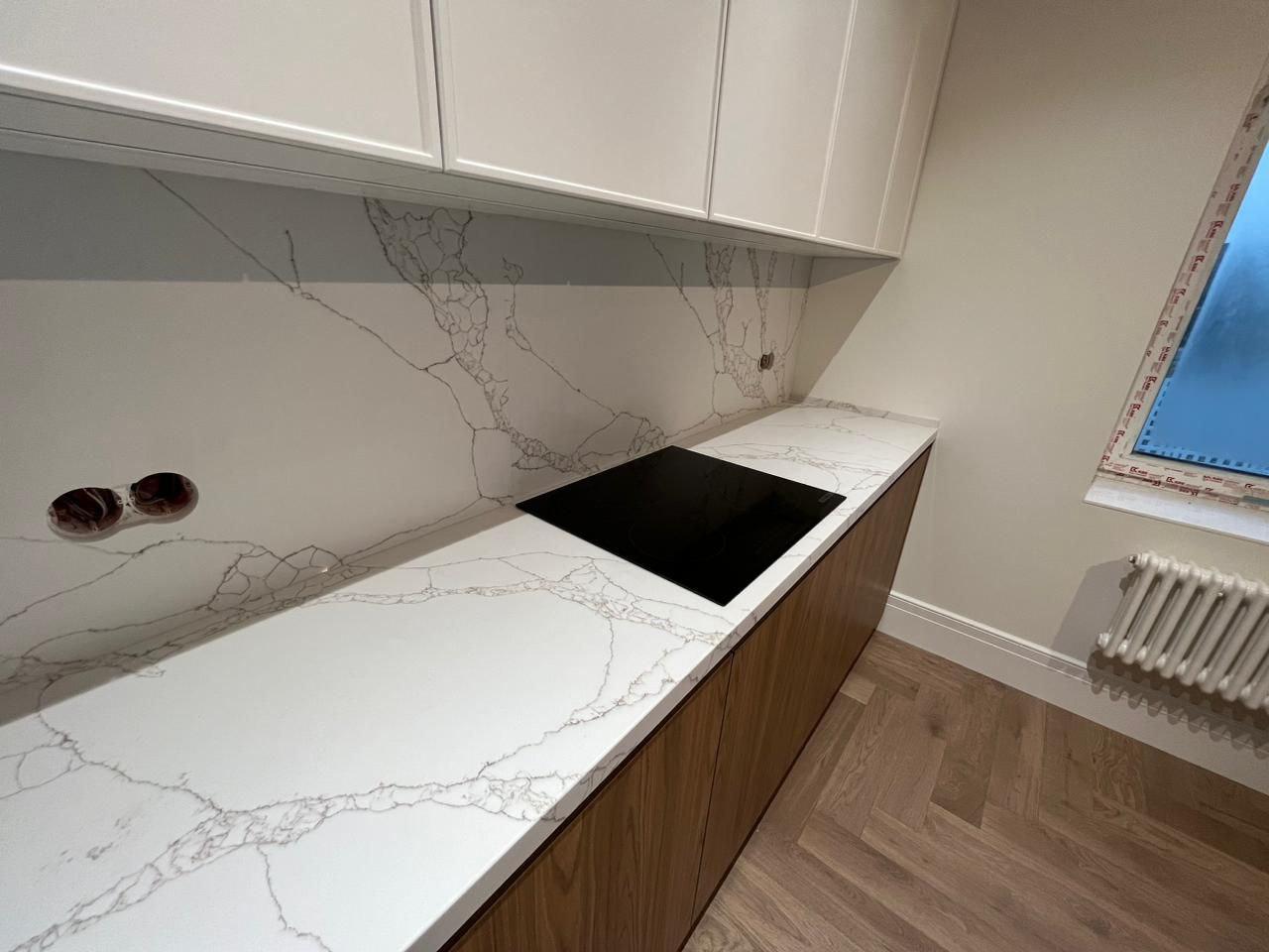 Уникальная кухонная угловая столешница и фартук изготовлены из кварцевого агломерата - Avant Quartz 7470 Калакатта Берн. Этот белый камень с темными прожилками пользуется большой популярностью среди наших клиентов, благодаря своей выразительности и способности притягивать взгляды.