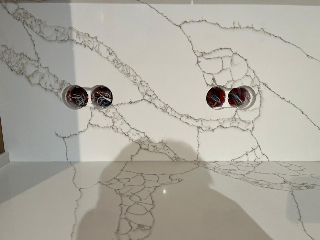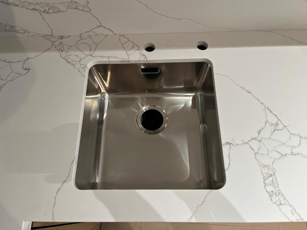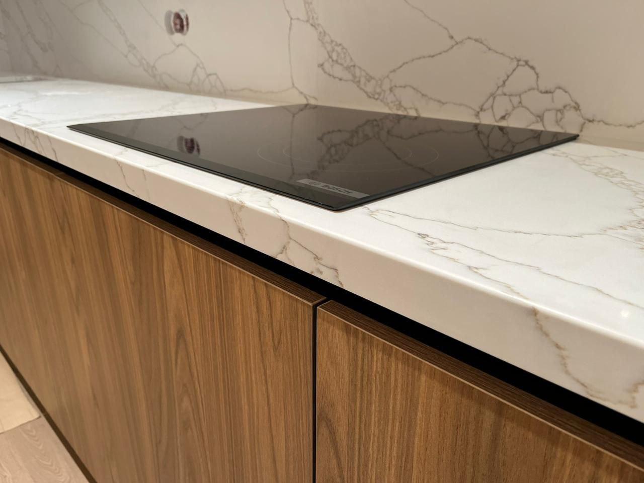 Уникальная кухонная угловая столешница и фартук изготовлены из кварцевого агломерата - Avant Quartz 7470 Калакатта Берн. Этот белый камень с темными прожилками пользуется большой популярностью среди наших клиентов, благодаря своей выразительности и способности притягивать взгляды.