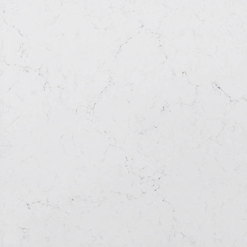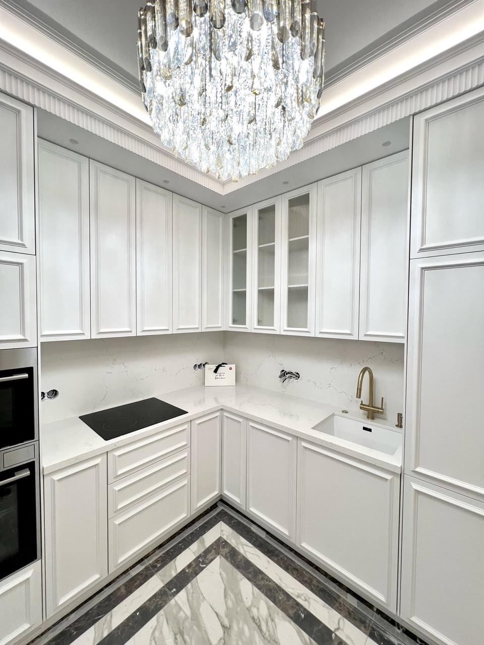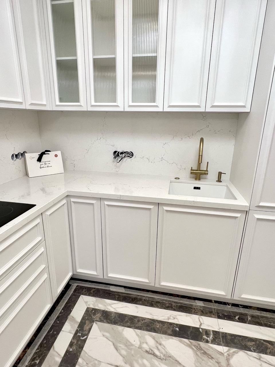 Угловая столешница сделана из белого кварцевого агломерата Vicostone BQ-8815 Misterio. Рисунок дополняют мелкие прожилки серого цвета.