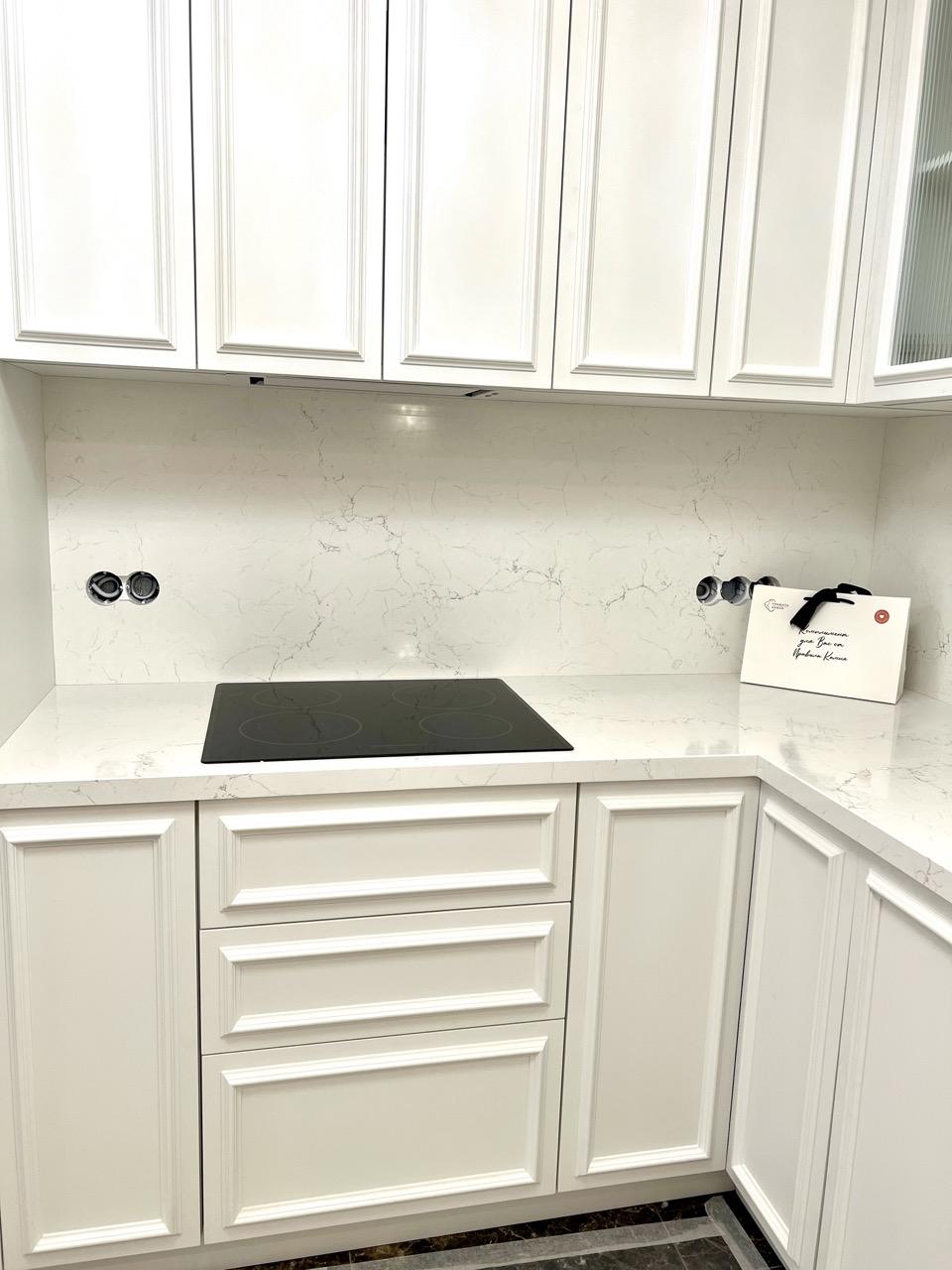Угловая столешница и фартук из светлого искусственного камня